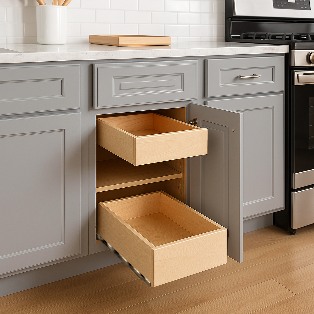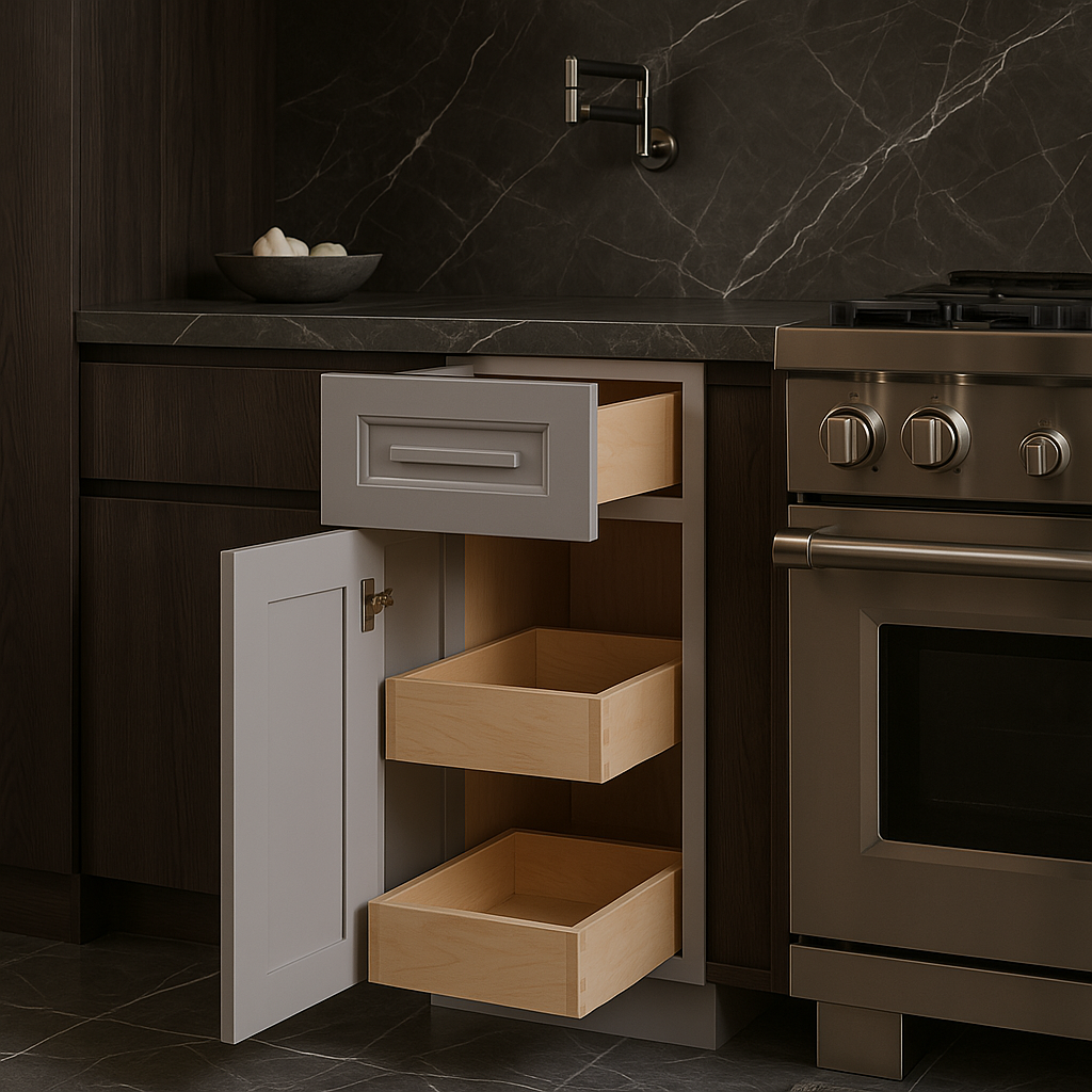 A: The cabinet includes two soft-close roll-out trays and a spice tray insert, ideal for organizing kitchen essentials.