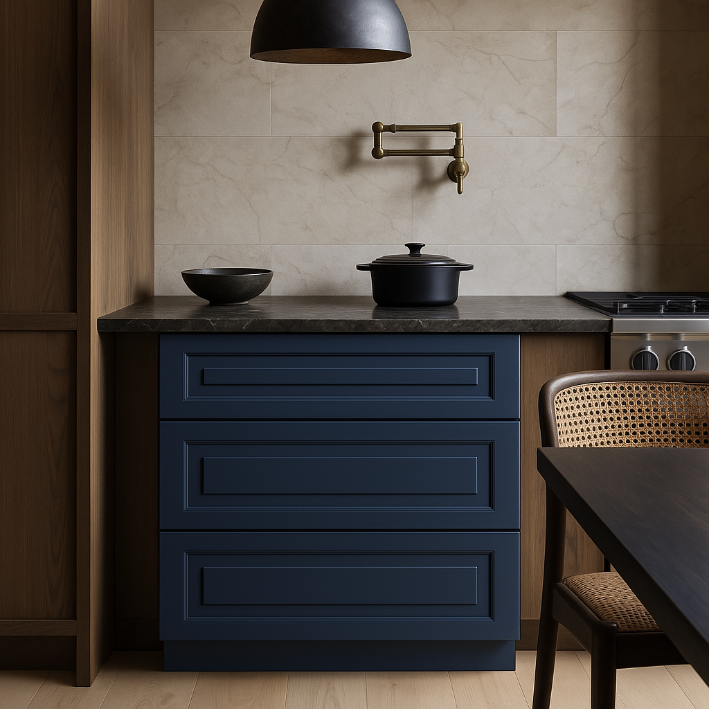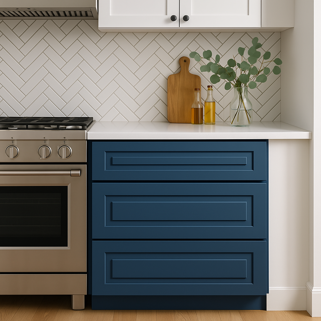 The Grayson Mythic Blue Cooktop Cabinet combines timeless elegance with modern functionality. Featuring a durable plywood construction, soft-close technology, and a scuff-resistant painted finish, it offers both style and practicality for your kitchen.