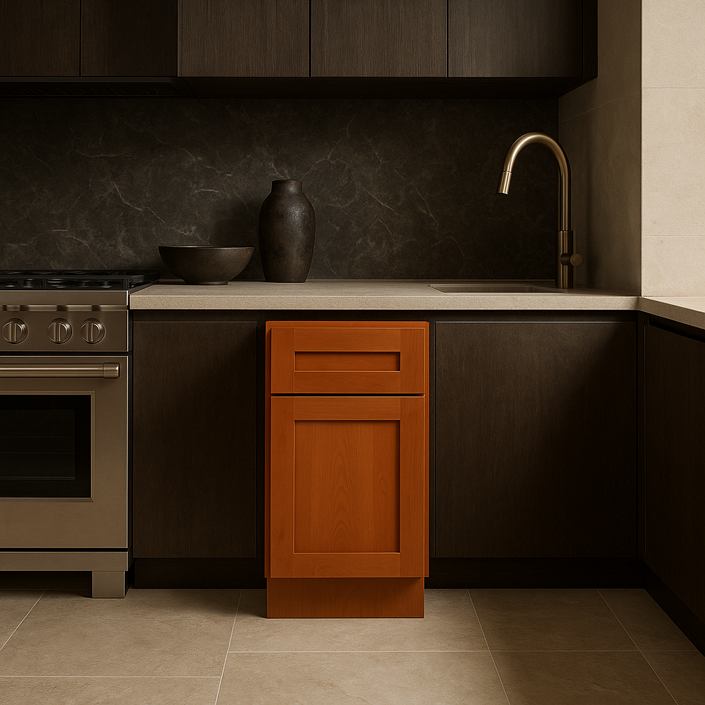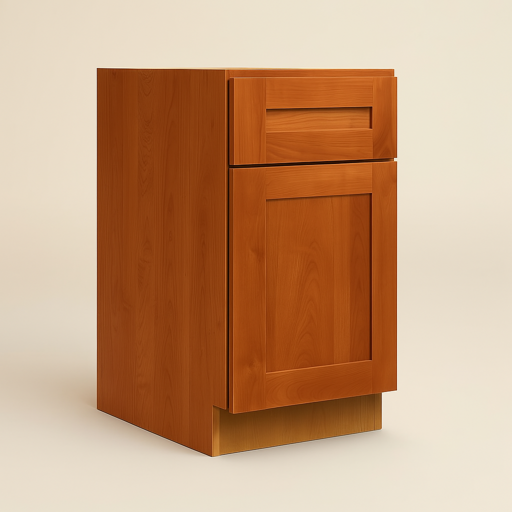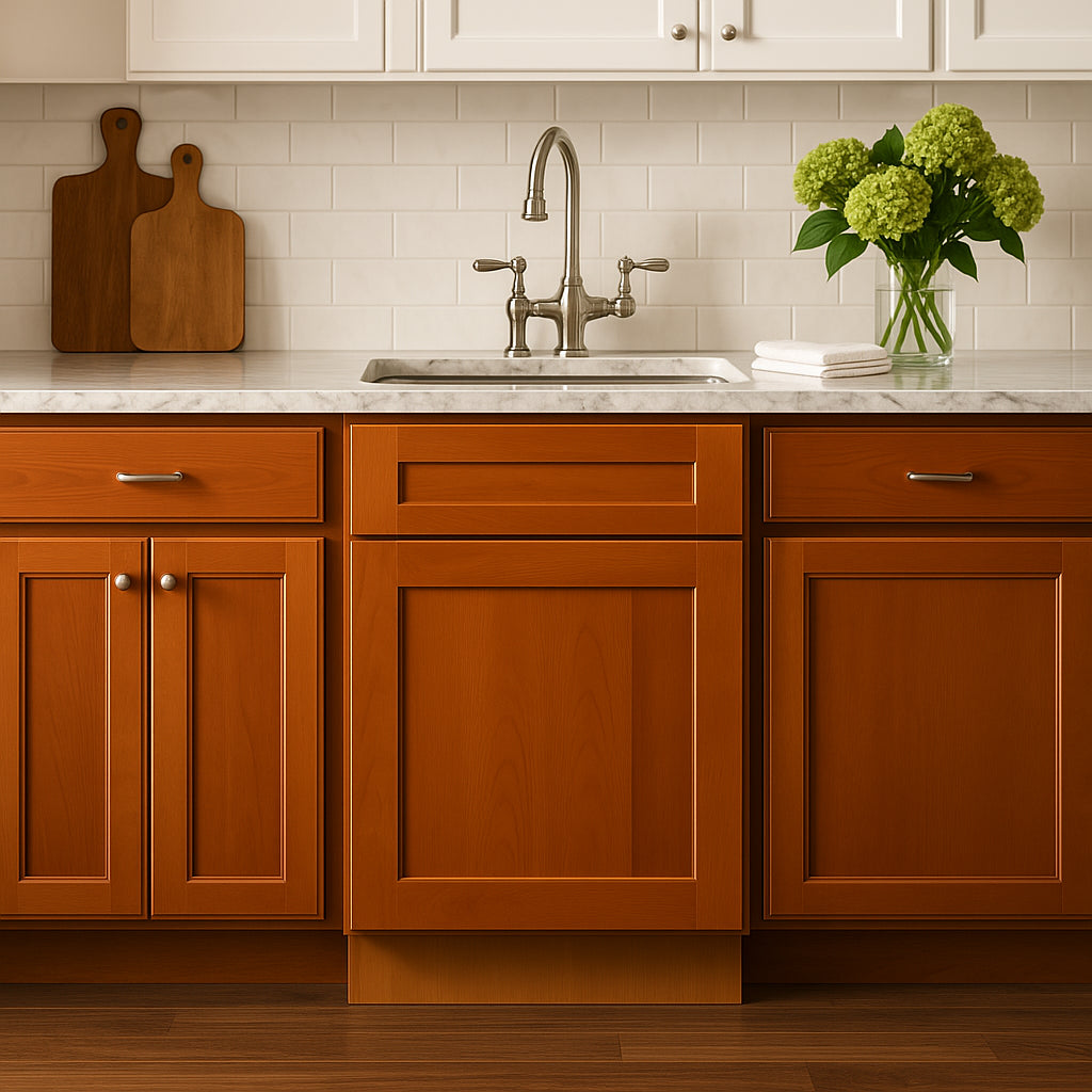 • Shaker Style: Solid hardwood doors and drawer fronts with a warm cinnamon finish.