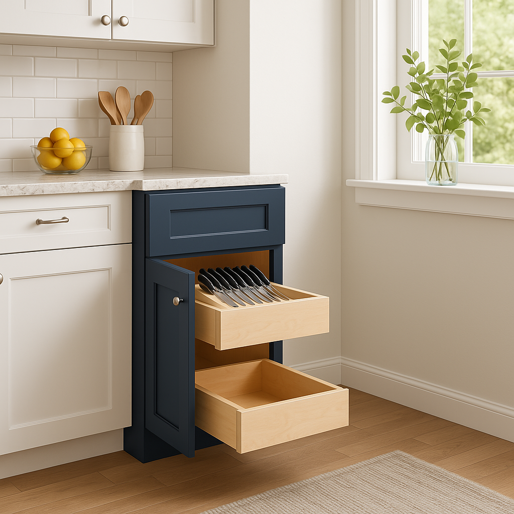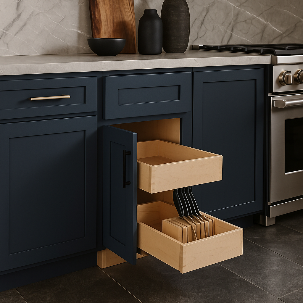 • Convenient Storage: Includes two soft-close rollout trays and a knife block insert for organized kitchen essentials.