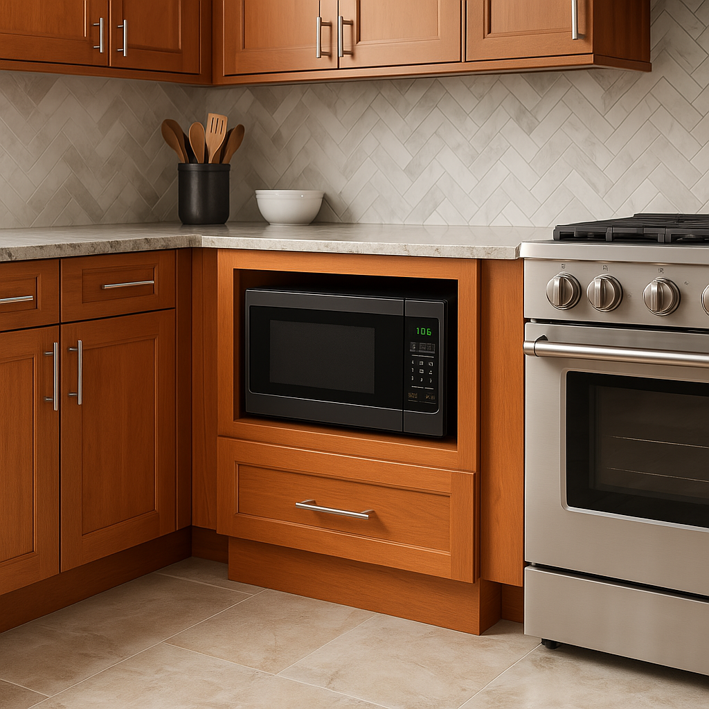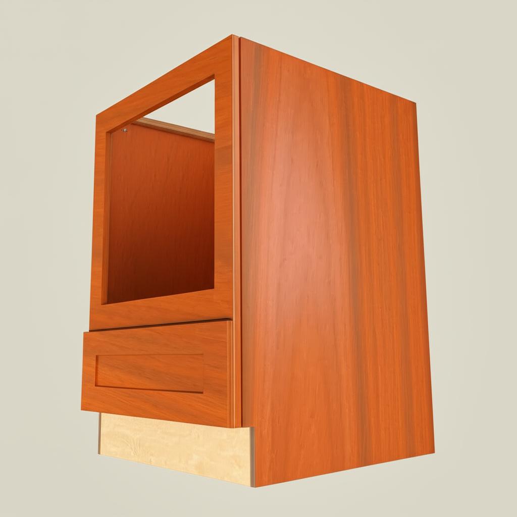 The Newport Microwave Base Kitchen Cabinet combines Shaker-style elegance with durable all-plywood construction. Its cinnamon stain finish and soft close features make it a stylish and functional addition to any kitchen.