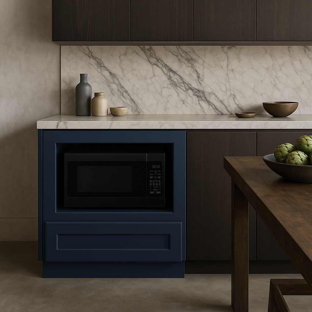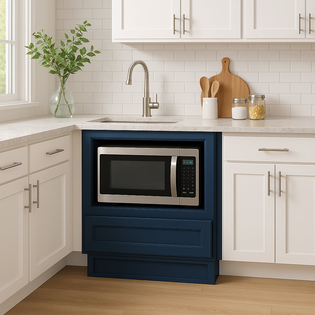 The Newport Mythic Blue Microwave Base Cabinet is a masterpiece of design and functionality. Its rich blue finish and shaker-style doors bring a sophisticated charm to any kitchen, blending classic elegance with modern aesthetics. Pair it with light countertops and gold hardware for a stunning contrast that transforms your space into a luxurious haven. This cabinet is not just a storage solution but a statement piece that elevates your kitchen's style and utility.