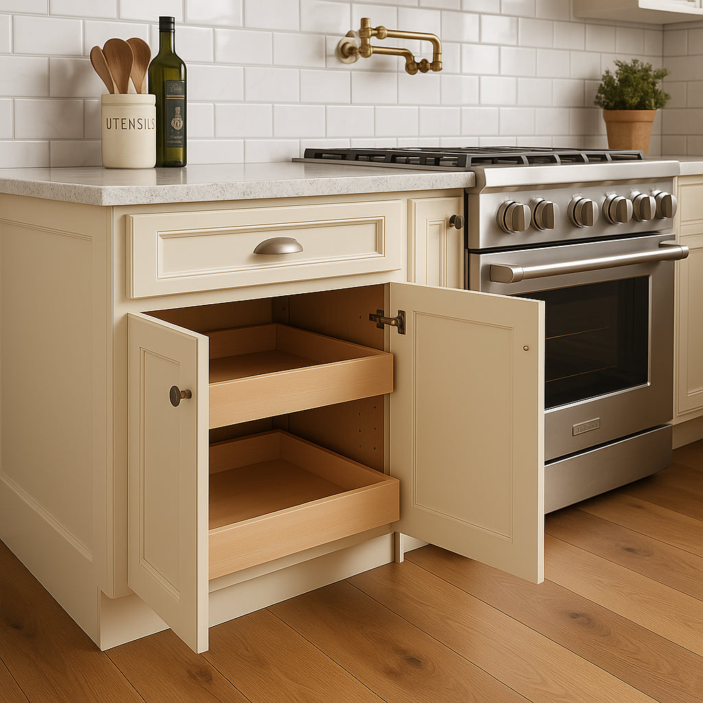 The Newport Cream Plywood Kitchen Cabinet combines classic design with modern functionality. Featuring durable CARB-compliant plywood construction, soft-close doors and drawers, and adjustable shelves, it offers both style and practicality for your kitchen.