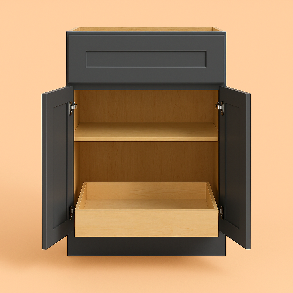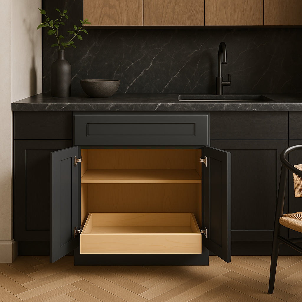 The Newport Shaker Kitchen Cabinet in Deep Onyx combines durable plywood construction with a bold painted finish and soft-close technology, offering both style and functionality for modern kitchens.