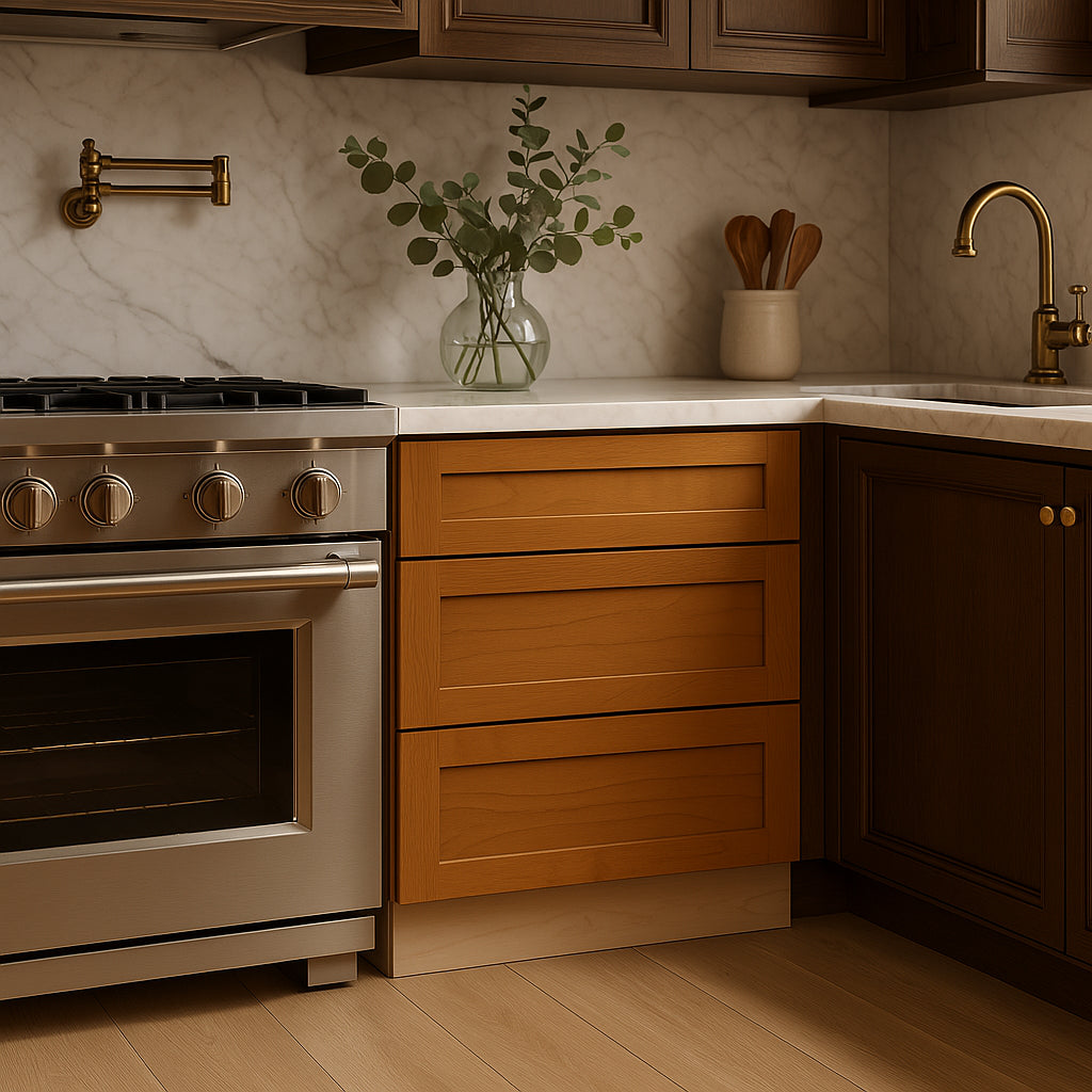 The Newport Cooktop Base Cabinet combines timeless Shaker-inspired design with modern functionality. Crafted from CARB II compliant plywood, it features a warm cinnamon finish, soft-close drawers, and a false top drawer front for cooktop compatibility.