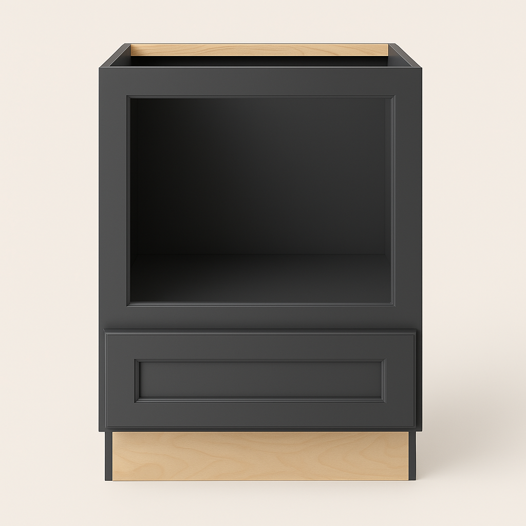 The Newport Deep Onyx Microwave Base Cabinet combines premium plywood construction with a sleek painted finish and shaker style design. Featuring soft close doors and drawers, dovetail hardwood drawer boxes, and adjustable shelves, this cabinet offers both durability and customizable storage for a sophisticated kitchen upgrade.