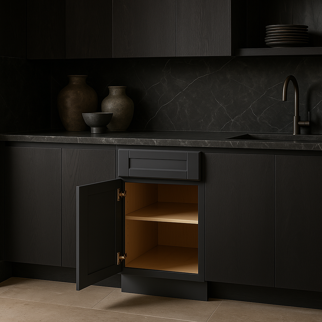 The Washington Onyx Base Kitchen Cabinet combines all-plywood construction with a bold Valiant Onyx finish, soft-close doors, and shaker-style design for a durable and elegant kitchen solution.