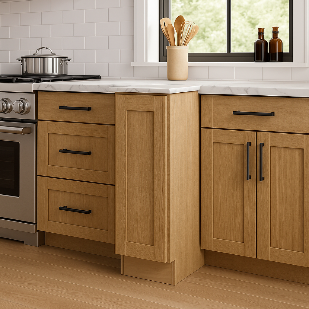 The Washington Base Kitchen Cabinet combines durable plywood construction with a Vanguard Oak finish and soft-close technology, offering both style and functionality for modern kitchens.