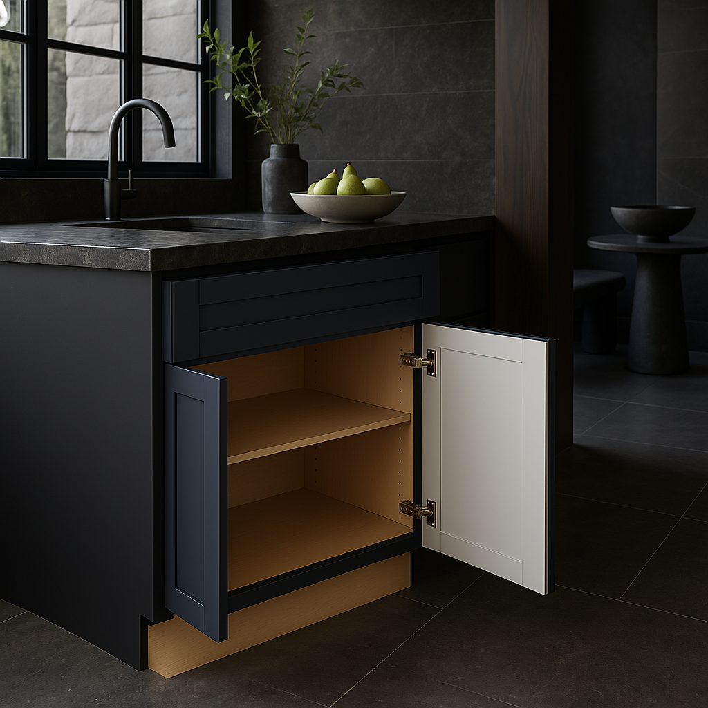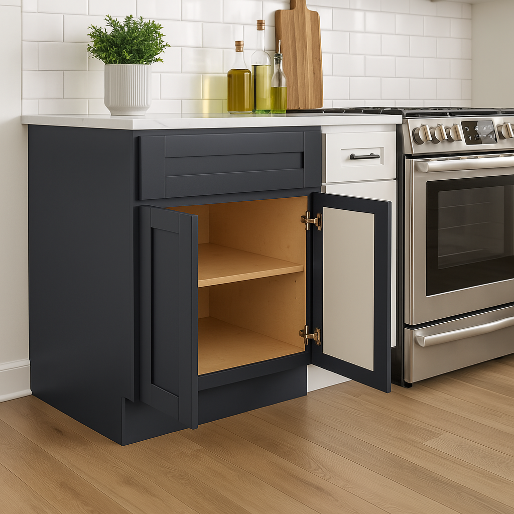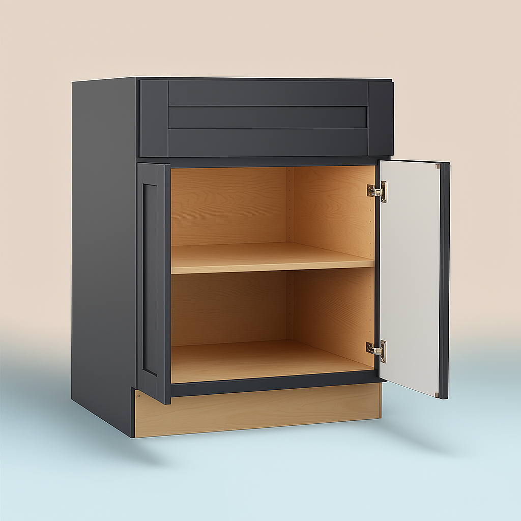 The Washington Plywood Base Kitchen Cabinet in Valiant Onyx combines modern sophistication with durable all-plywood construction. Featuring soft close doors and a shaker-style design, it offers both functionality and timeless elegance.