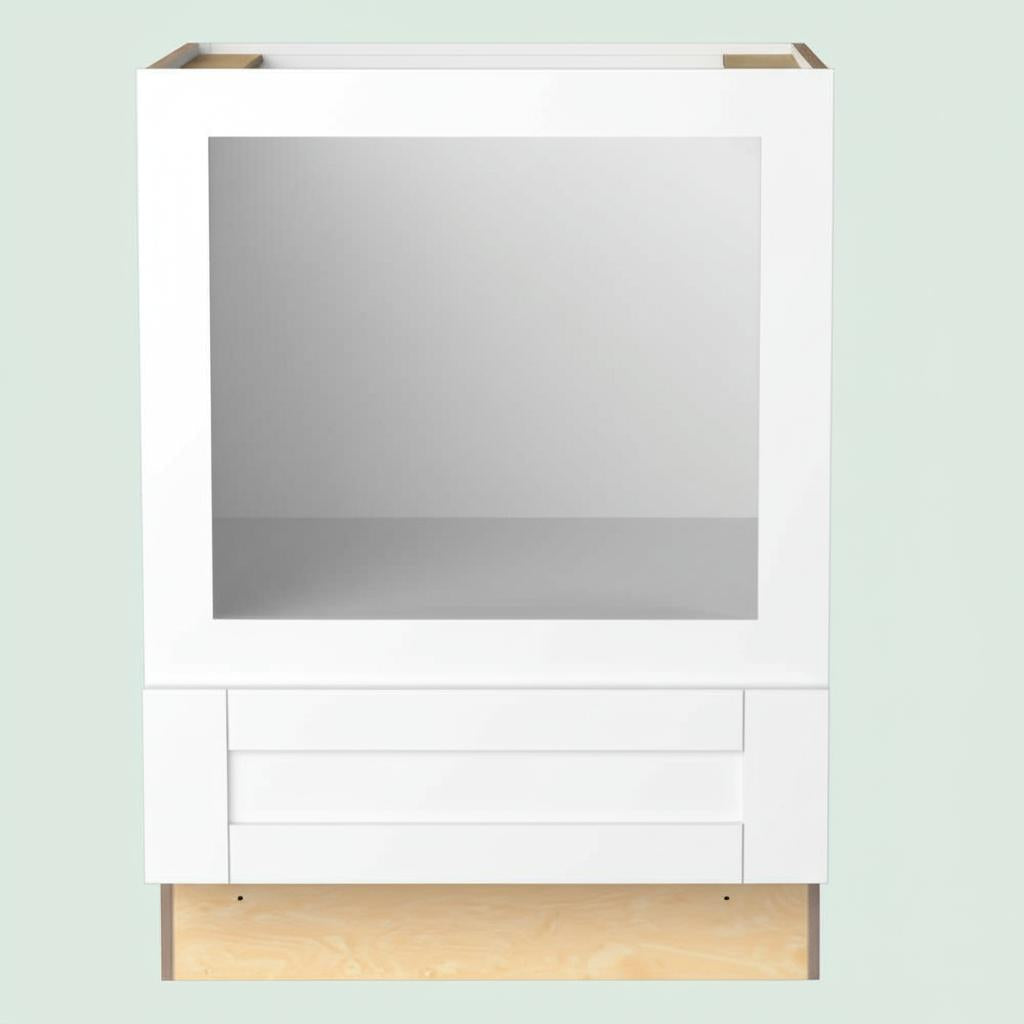 The Vesper White Thermofoil Microwave Cabinet combines durable plywood construction with a sleek, modern finish. Featuring soft-close doors and drawers, adjustable shelves, and a custom look, this cabinet is perfect for enhancing your kitchen's functionality and style.