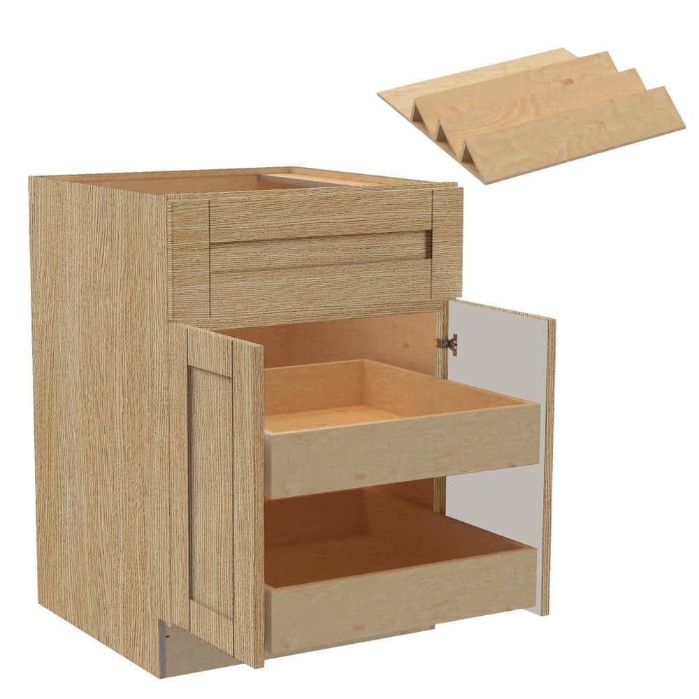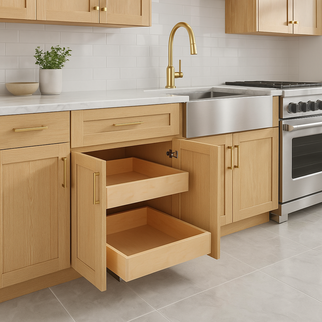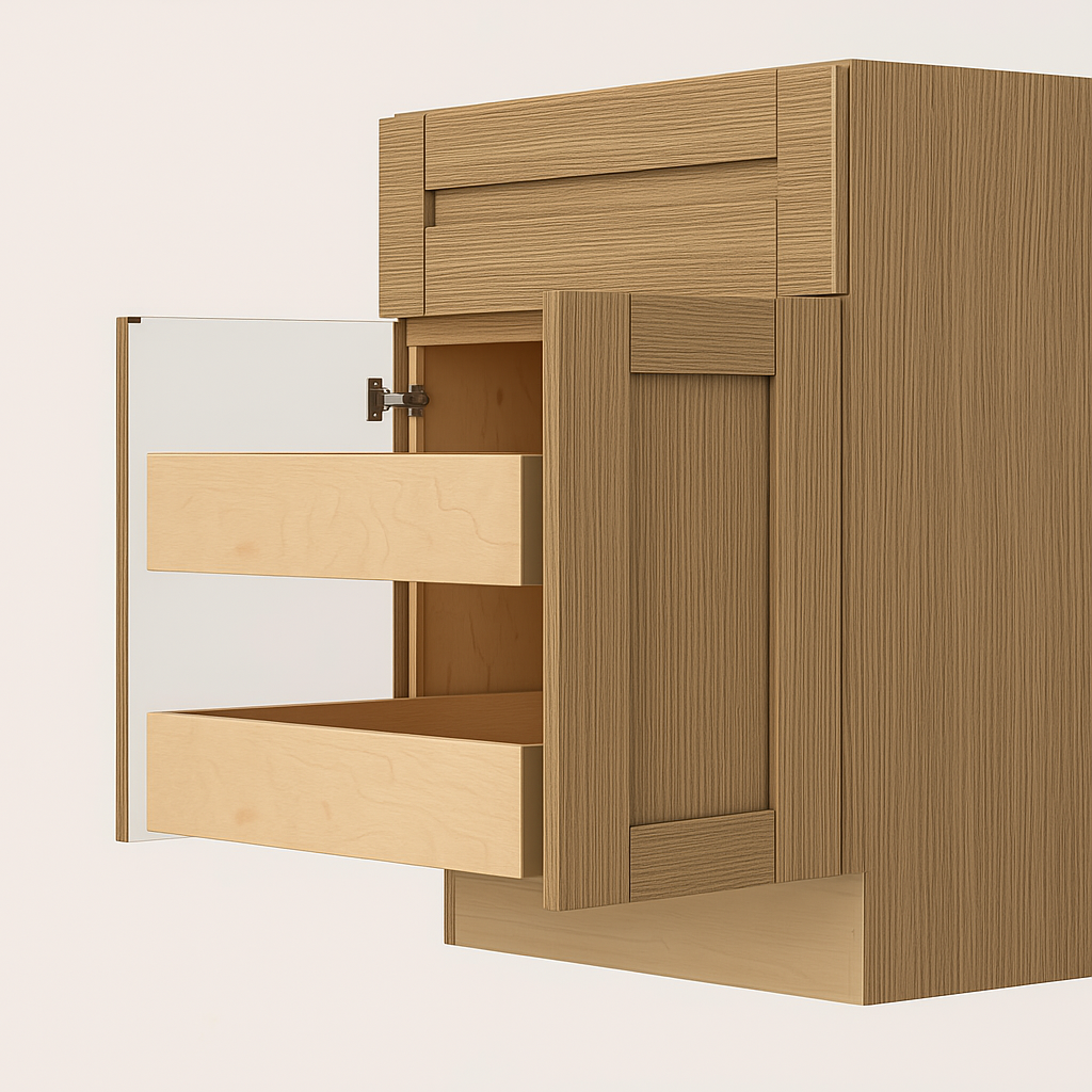 • Elegant Design: Shaker-style doors with a Vanguard Oak finish for a timeless aesthetic.