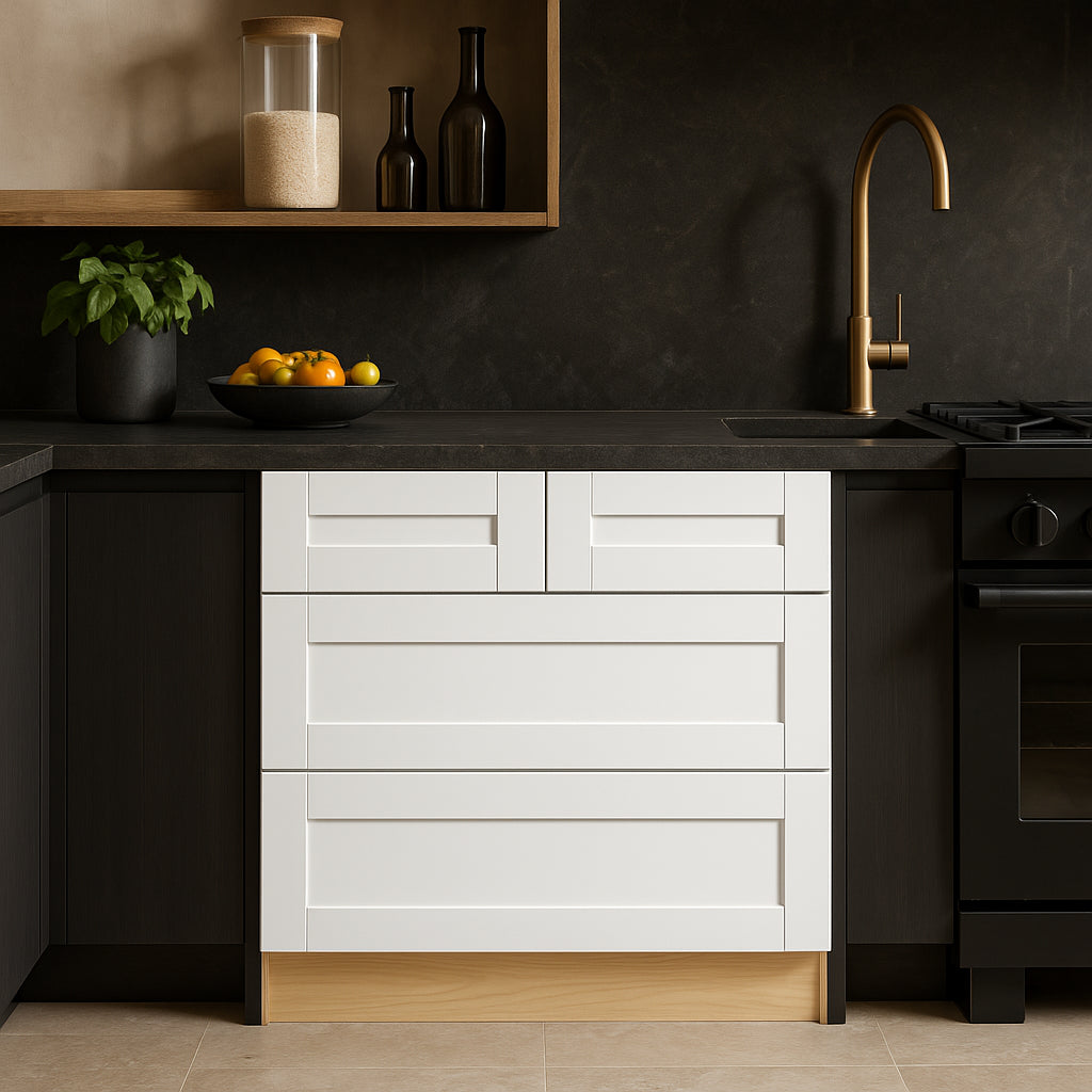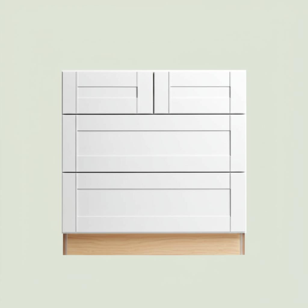 The Vesper White Shaker Cooktop Base Cabinet combines durable CARB II compliant plywood construction with a bright, vinyl-clad finish. Featuring soft-close drawers and a shaker-style design, it offers both functionality and timeless elegance for your kitchen.