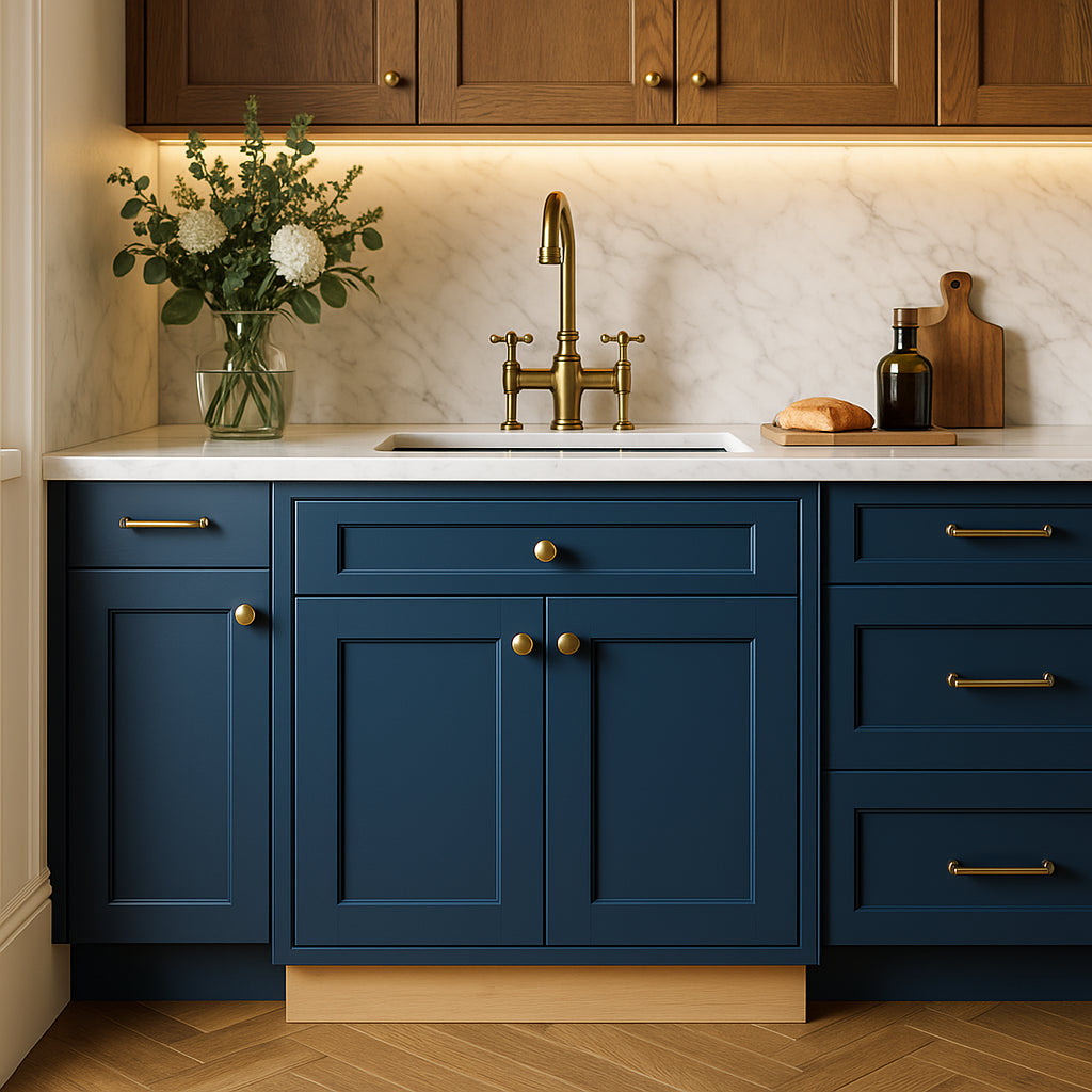 A: The cabinet boasts a durable, thermofoil vinyl finish in a striking deep blue color, which is both easy to clean and scuff-resistant.