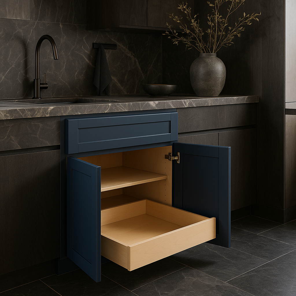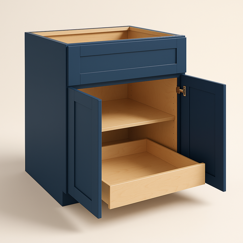 The Washington Vessel Blue Shaker Base Cabinet combines style and functionality with its deep blue vinyl finish, durable plywood construction, and soft-close features. Perfect for modern kitchens, it offers a blend of elegance and practicality.