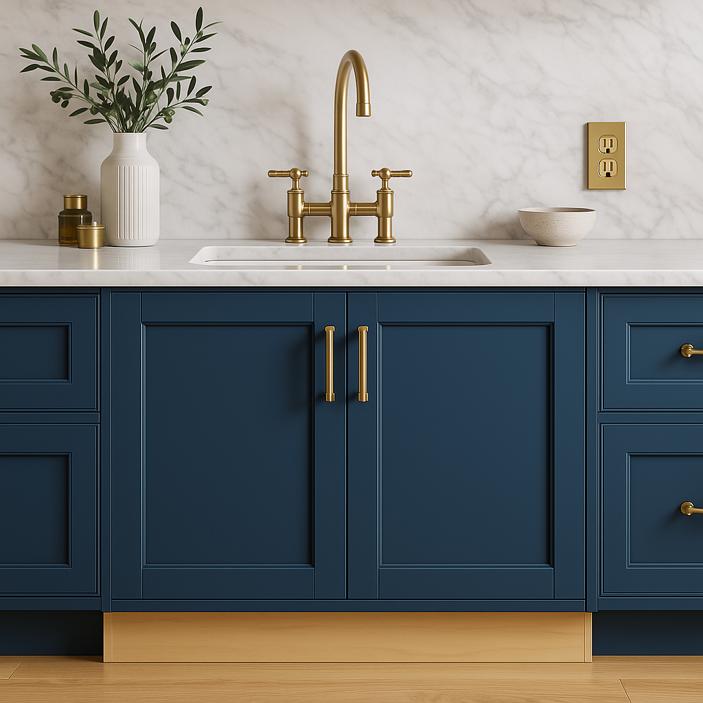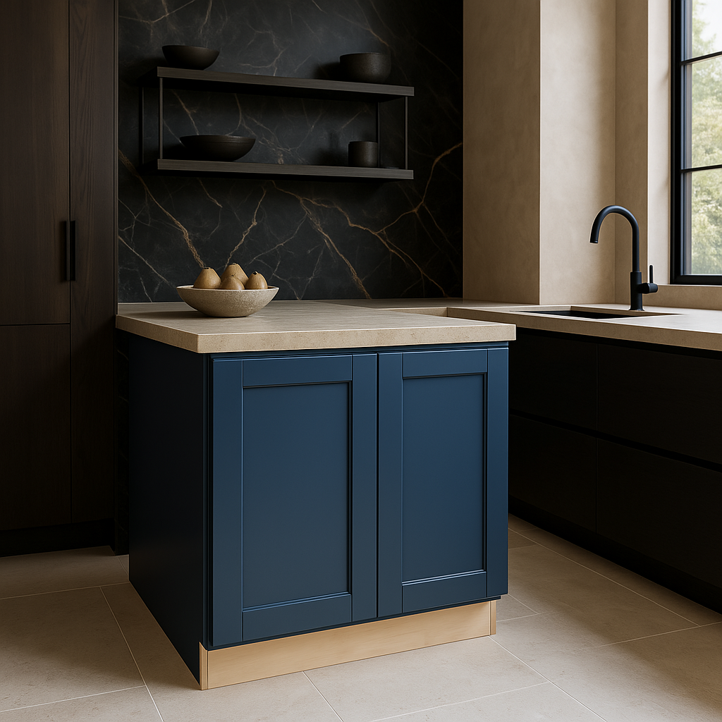 - Elegant Design: Shaker-inspired design with wide frames and square recessed panels, finished in a striking Vessel Blue.