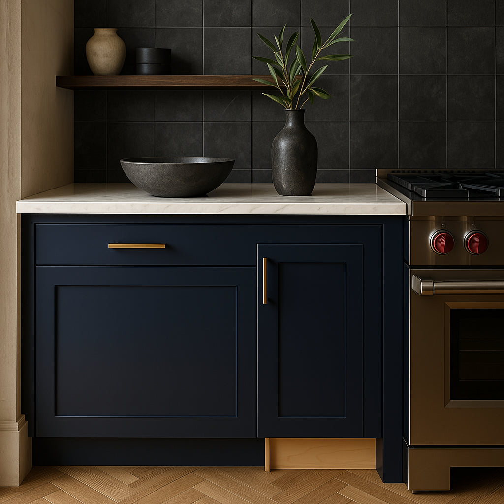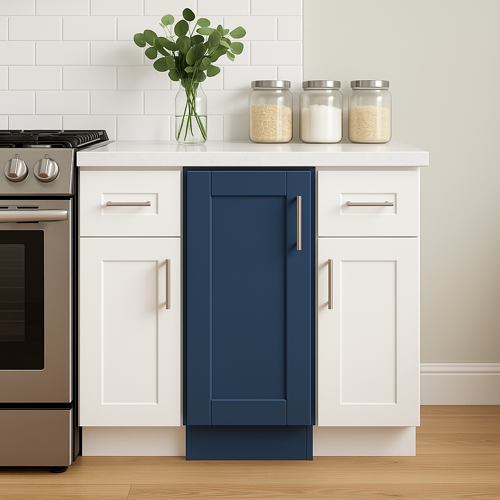 • Elegant Design: Shaker-style doors with a recessed center panel and a deep blue finish.