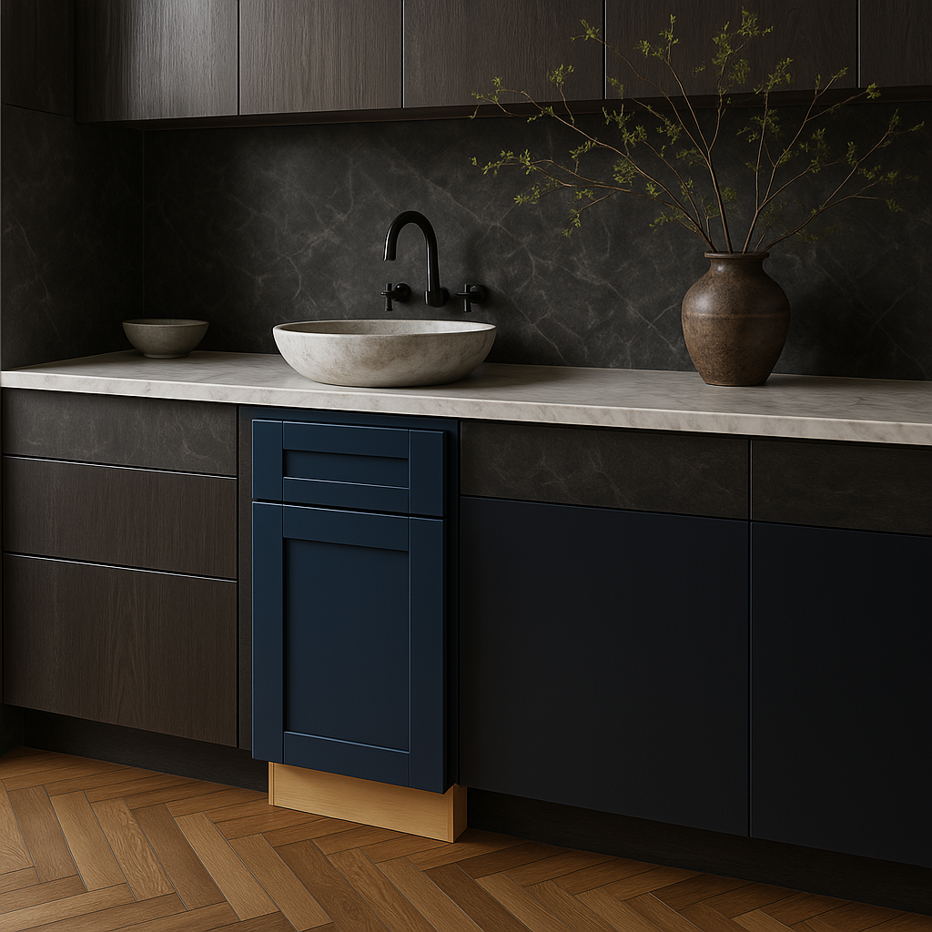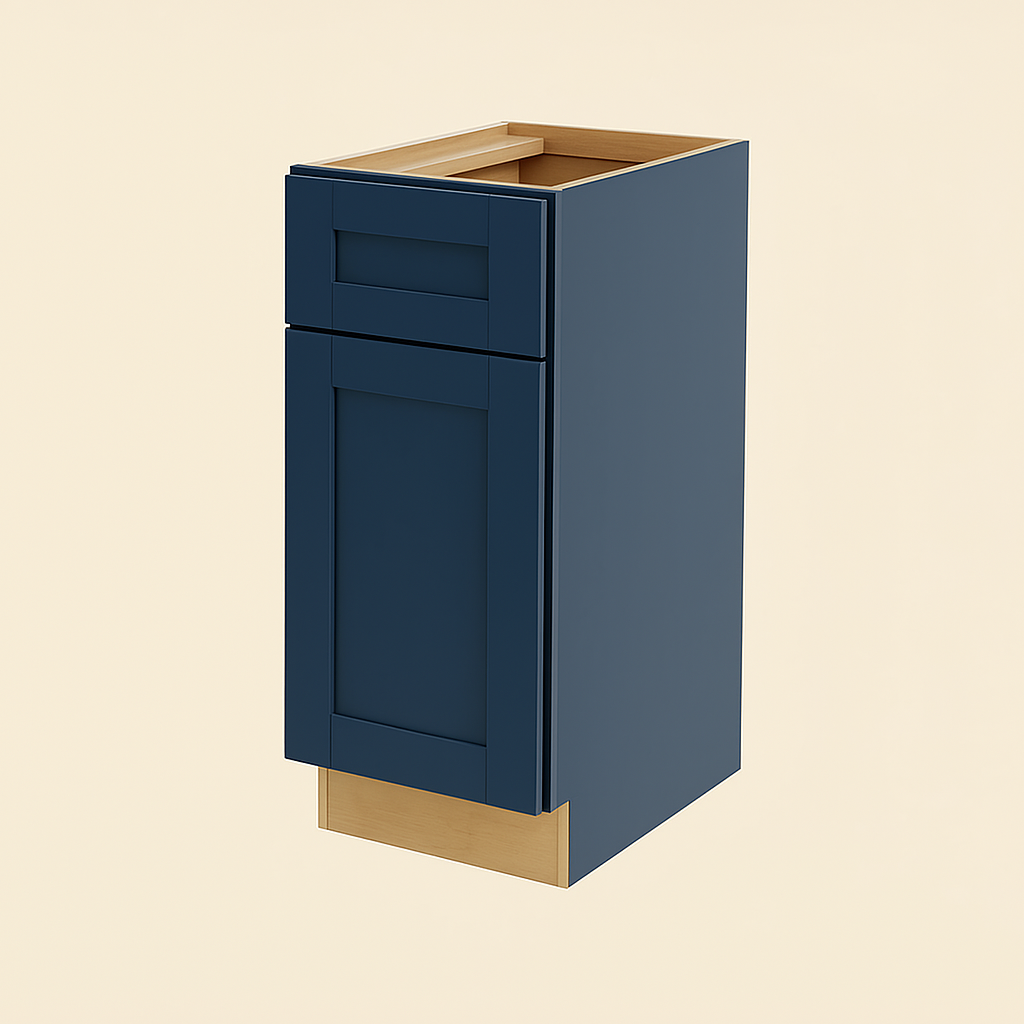 The Washington Vessel Blue Base Cabinet combines Shaker-style elegance with modern functionality. Crafted from durable CARB II compliant plywood, it features soft-close doors and a chic vinyl finish for easy maintenance.