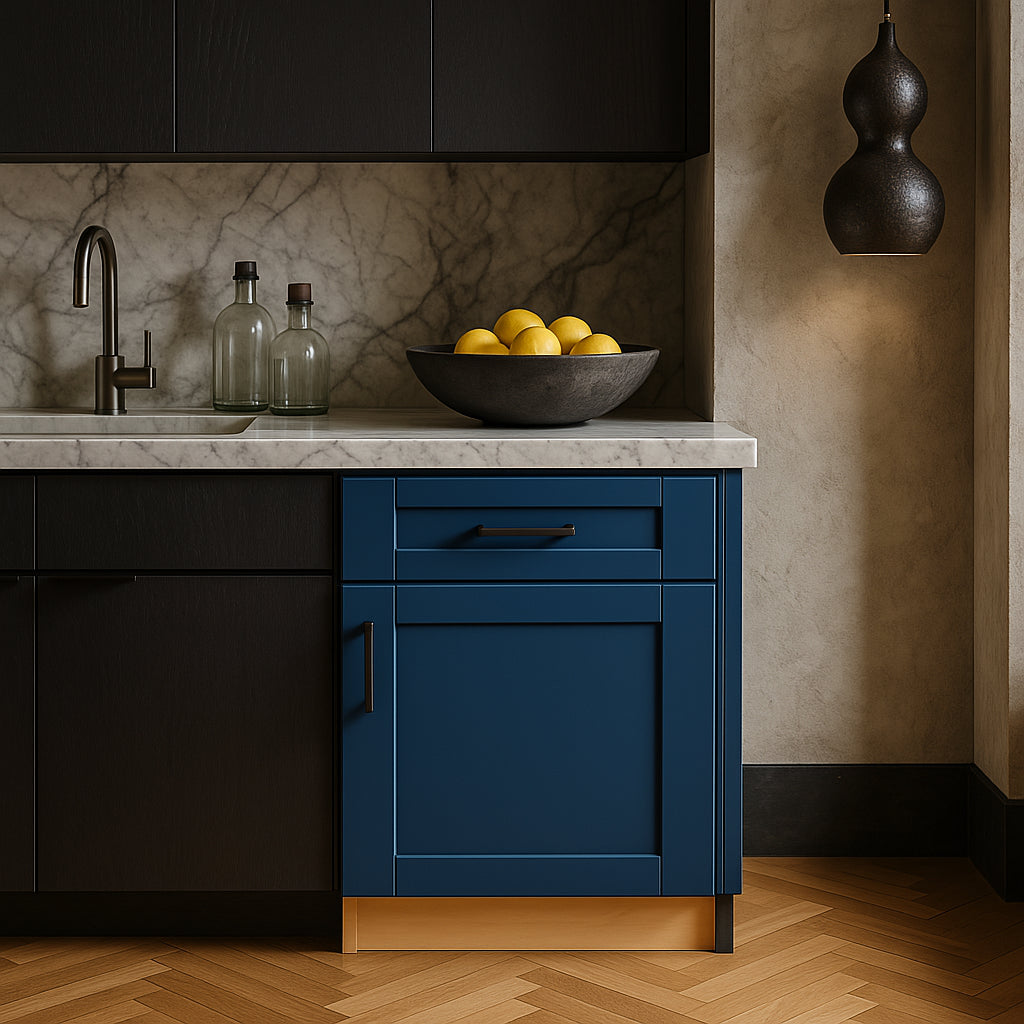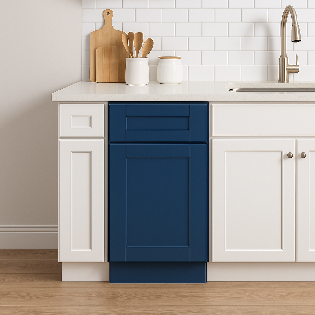 The Washington Vessel Blue Shaker Base Cabinet is a masterpiece of modern design, blending functionality with a nautical aesthetic. Its deep blue finish evokes the serenity of the ocean, while the contrasting white interior adds a refreshing brightness to your kitchen. Pair it with light countertops and minimalist decor to create a harmonious and inviting space. This cabinet is not just a storage solution but a statement piece that elevates your home to a new level of sophistication.
