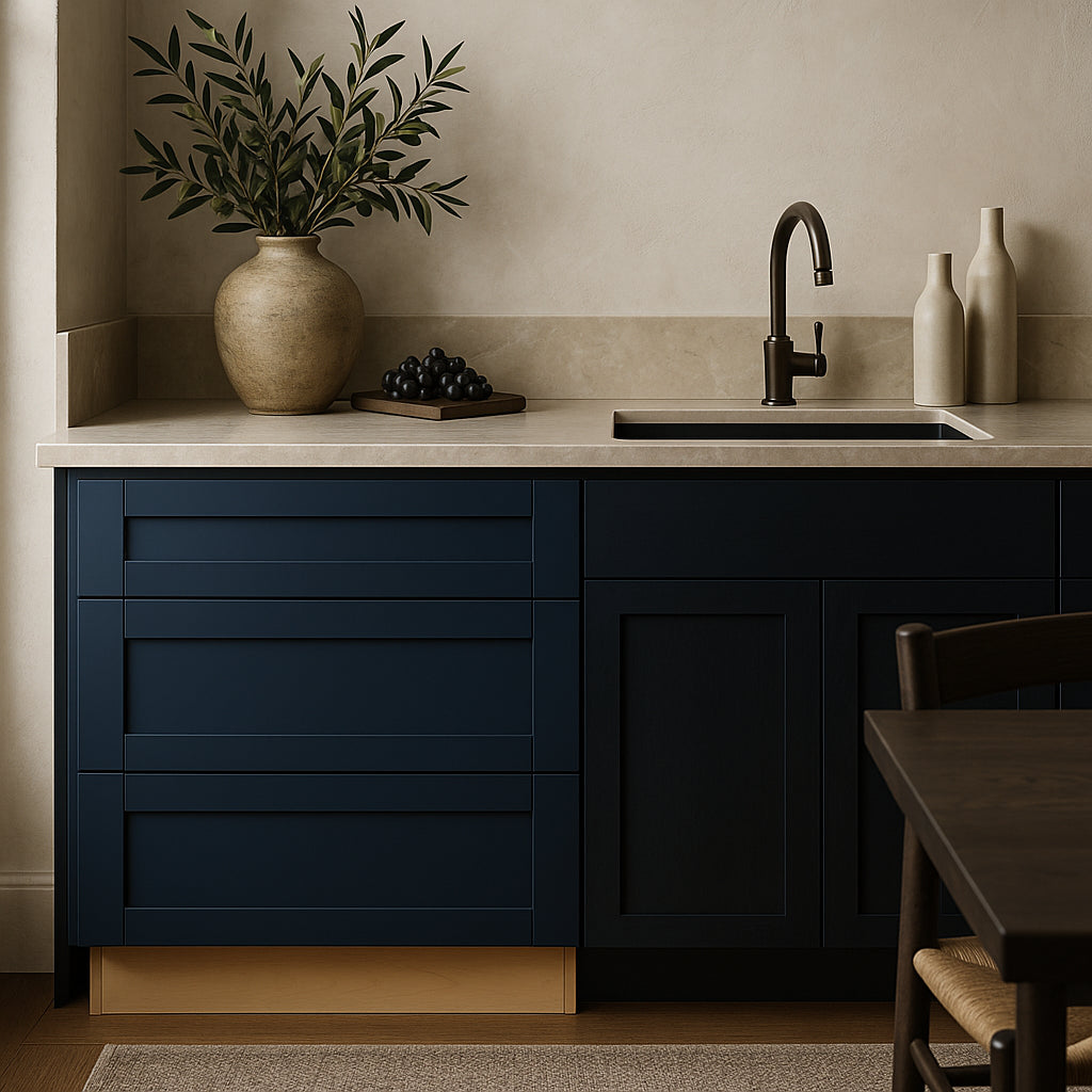 The Washington Vessel Blue Cooktop Base Cabinet combines striking design with practical functionality. Featuring a durable plywood construction and a vibrant blue vinyl finish, it offers ample storage and seamless integration for drop-in cooktops.