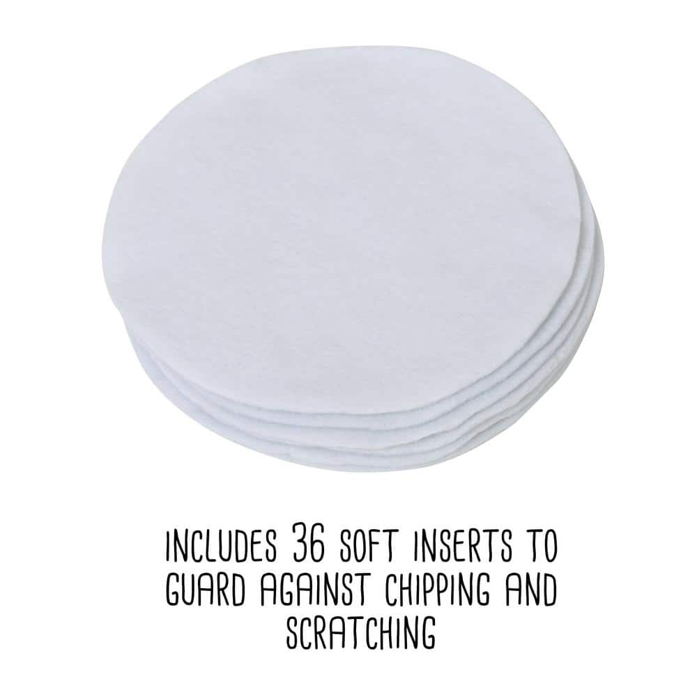 Protective Inserts: Includes 36 soft inserts to protect dinnerware from chipping.