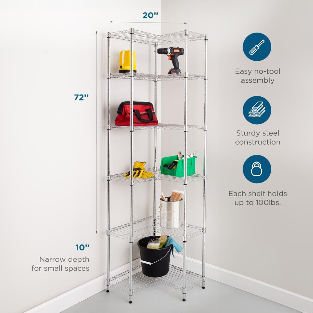 Maximize organization and space with the Honey Can Do 6-Tier L Corner Shelving Unit. Perfect for garages, utility rooms, or pantries, this sleek chrome shelving offers durable steel construction that supports up to 100 lbs per shelf. Its smart corner design effortlessly optimizes your storage potential.