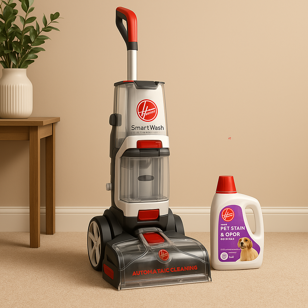 The HOOVER SmartWash Advanced Automatic Carpet Cleaner simplifies carpet cleaning with motion-sensing technology and HeatForce drying. Ideal for pet owners, it includes a powerful solution to tackle tough stains and odors.