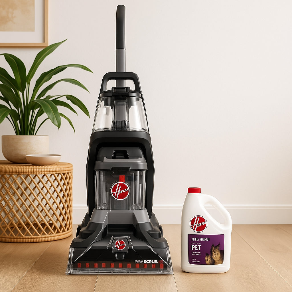 The HOOVER Turbo Scrub XL Carpet Cleaner is designed to tackle deep stains with its advanced spin scrub brushes and HeatForce drying technology. It includes a pet-friendly cleaning solution, making it ideal for homes with pets.