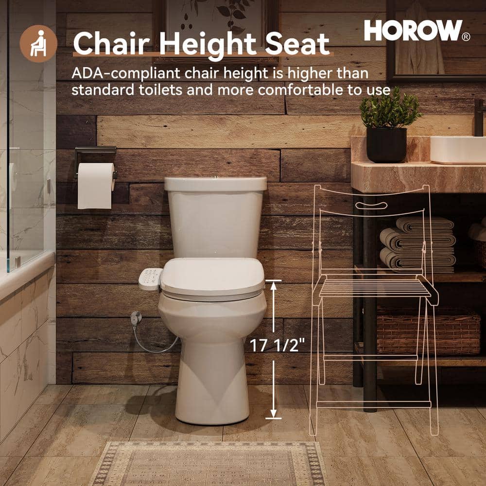 Experience luxury and efficiency with the HOROW ADA-Compliant Dual Flush Elongated Toilet featuring a state-of-the-art smart bidet seat. This innovative product combines high-efficiency flushing with a suite of comfort-enhancing bidet features, such as adjustable spray settings and a heated seat.