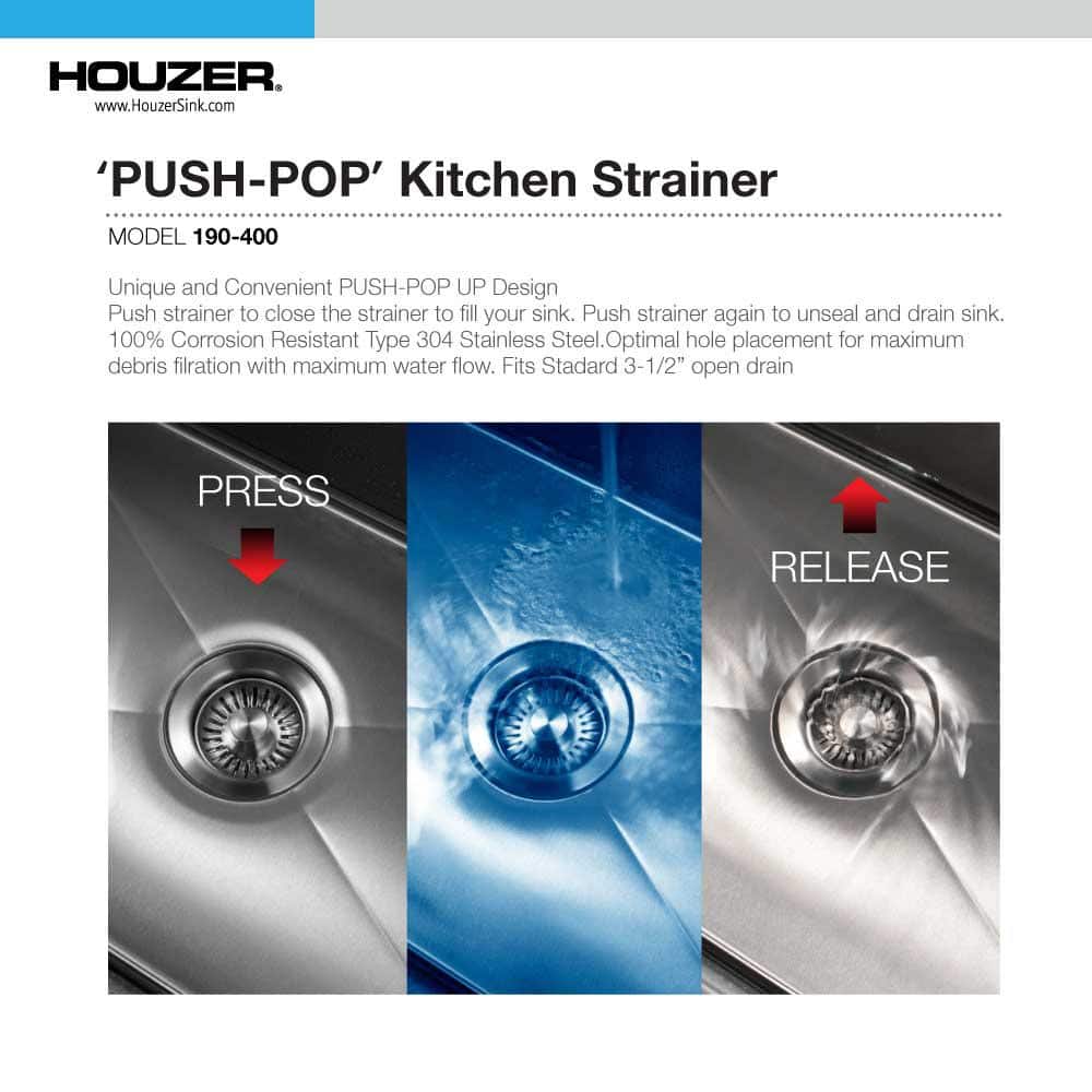 The HOUZER Push-Pop Kitchen Basket Strainer is designed to simplify kitchen tasks with its easy push functionality. Made from corrosion-resistant Type 304 stainless steel, it ensures durability and effective debris capture, adding convenience and longevity to your kitchen setup.