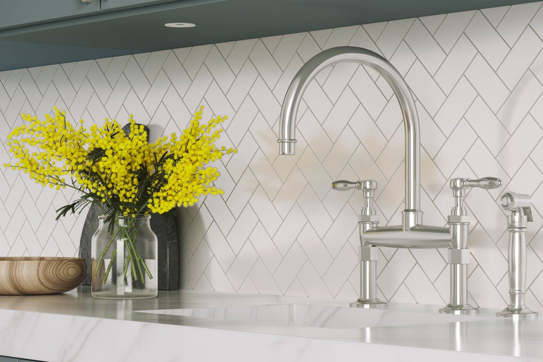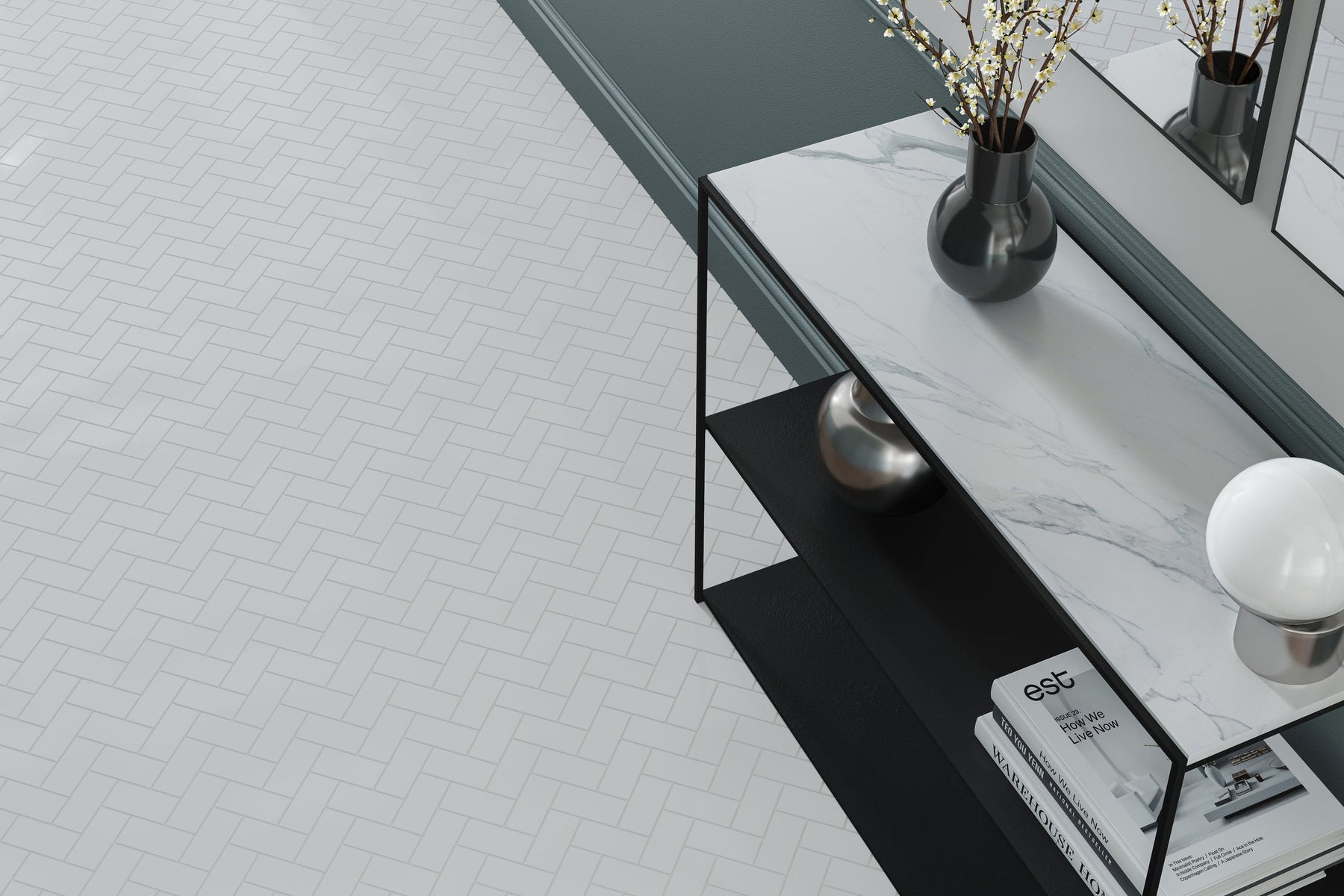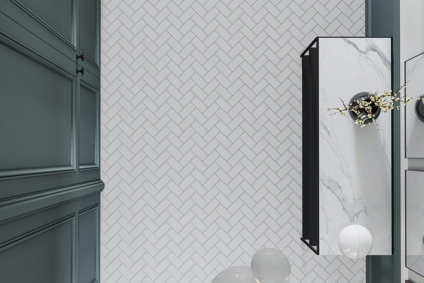 Bring home Hudson’s glossy herringbone to create a bright, timeless wall statement with easy maintenance.