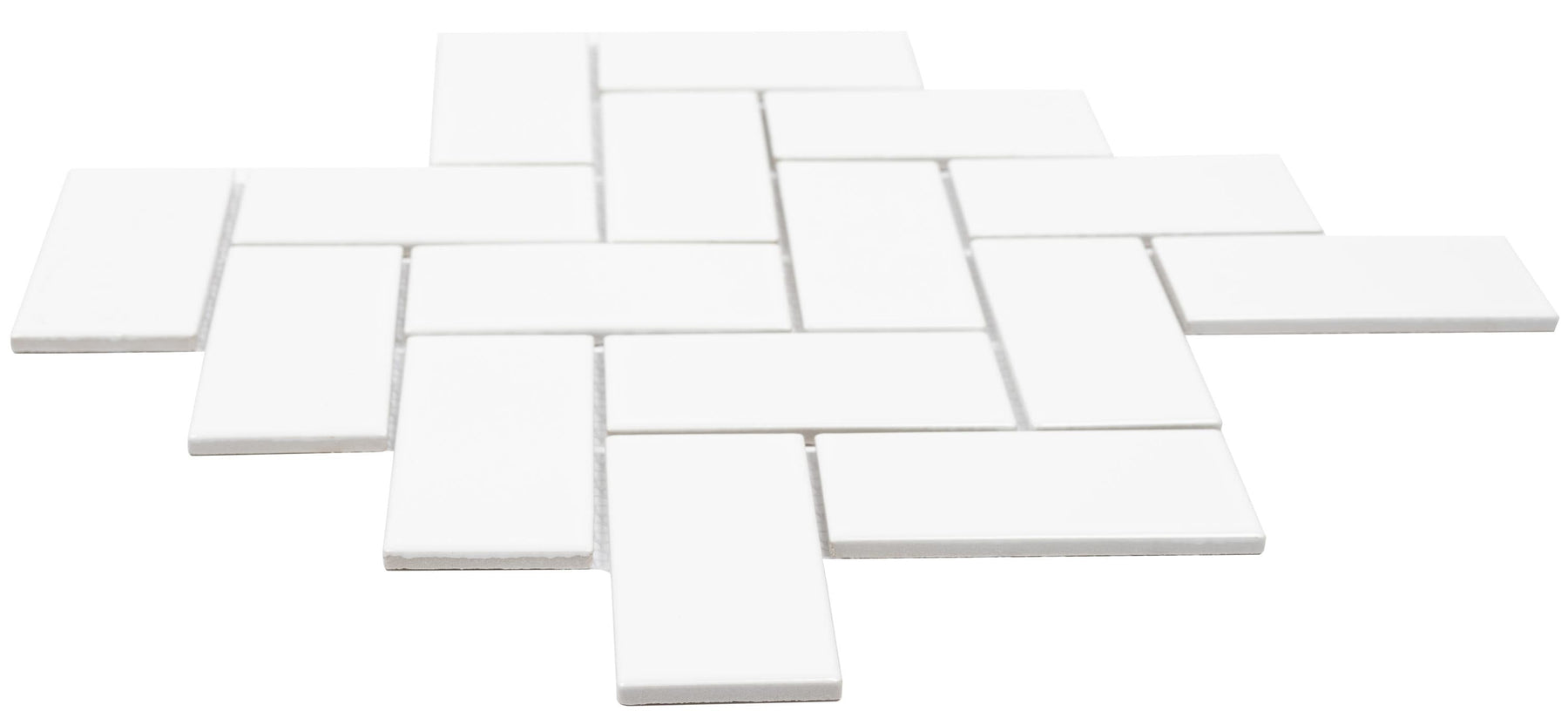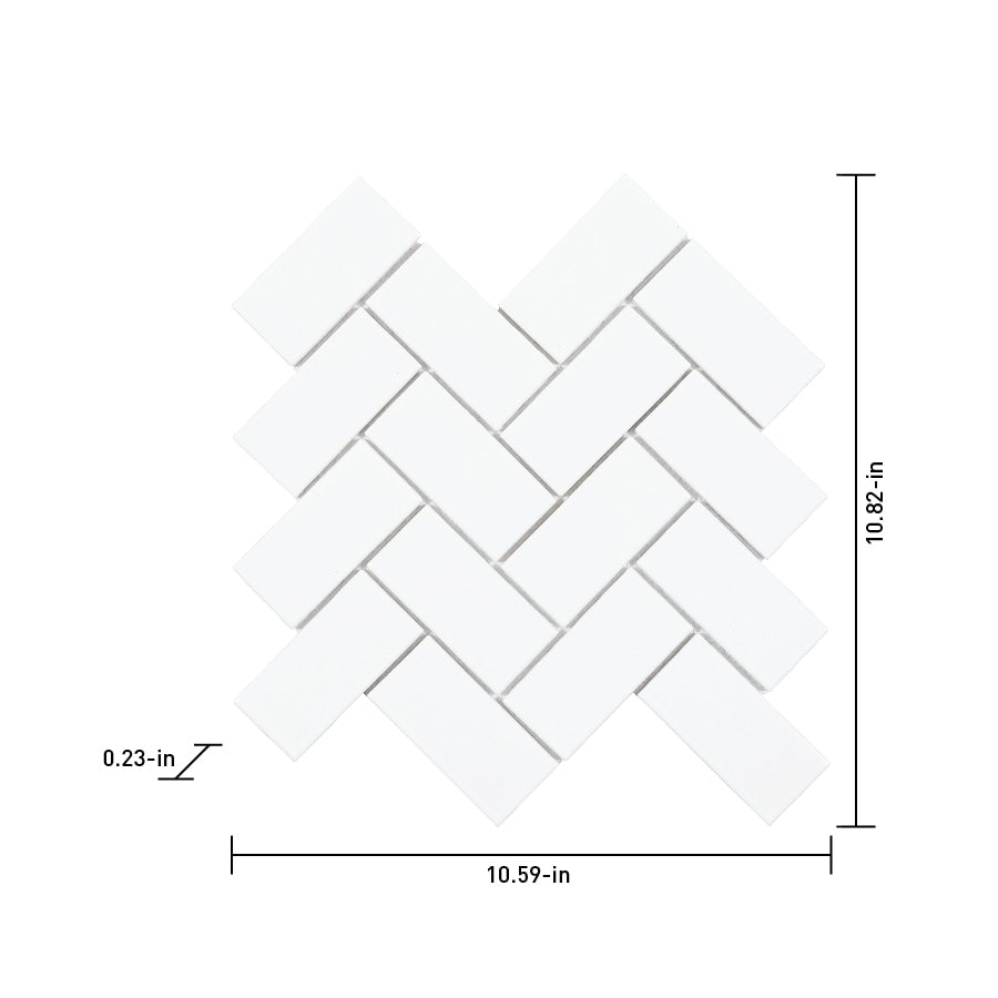 A crisp, brilliant-white porcelain mosaic in a classic herringbone layout, perfect for backsplashes and shower walls. The glossy, waterproof surface offers easy cleaning and timeless appeal for kitchens, baths, and laundry rooms.
