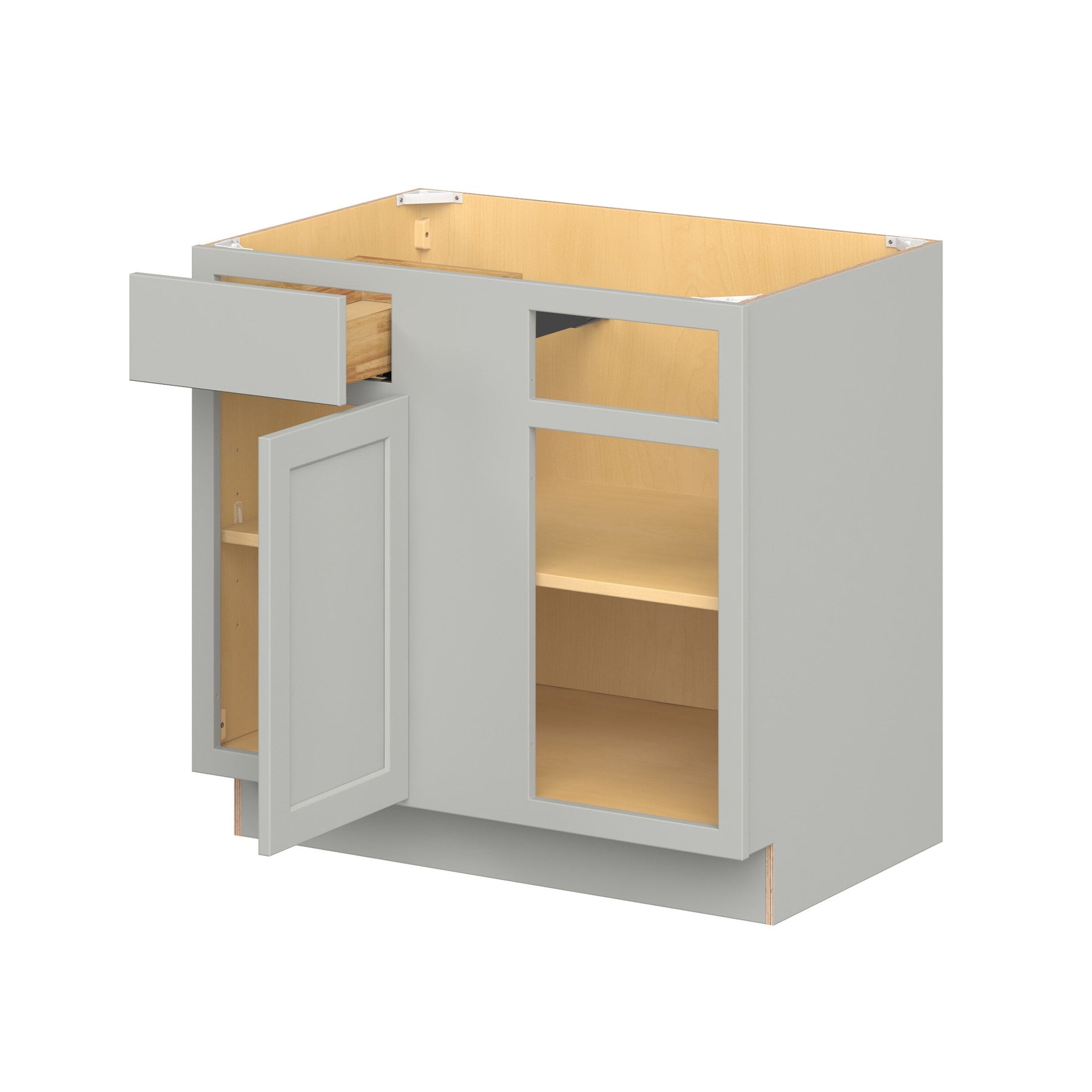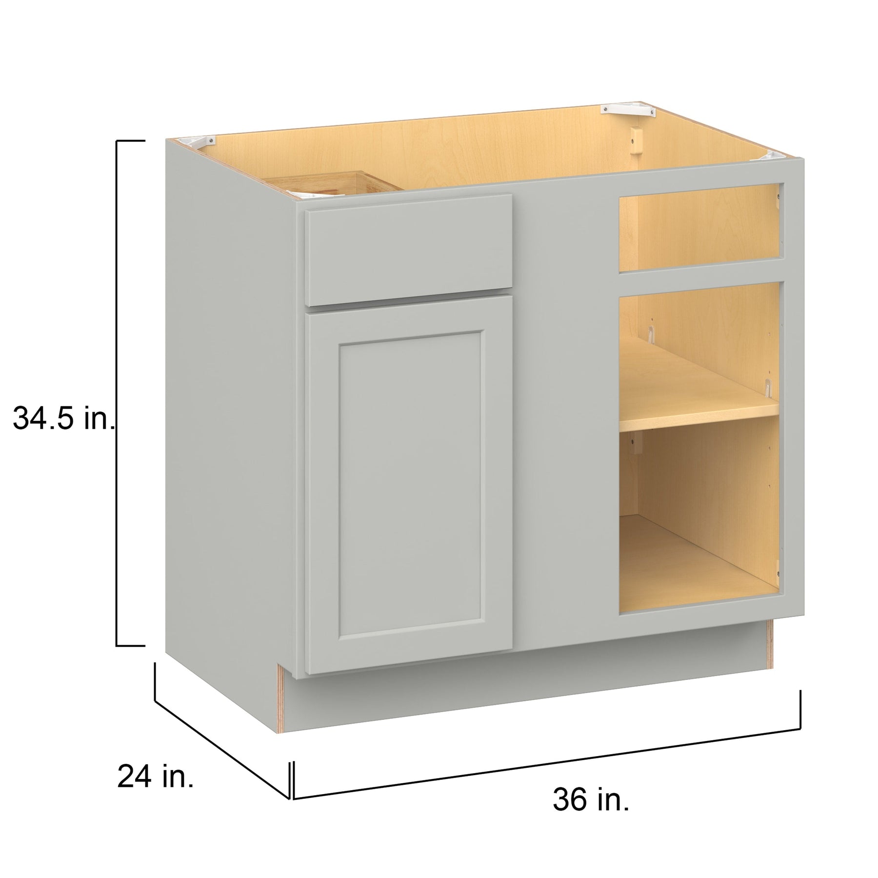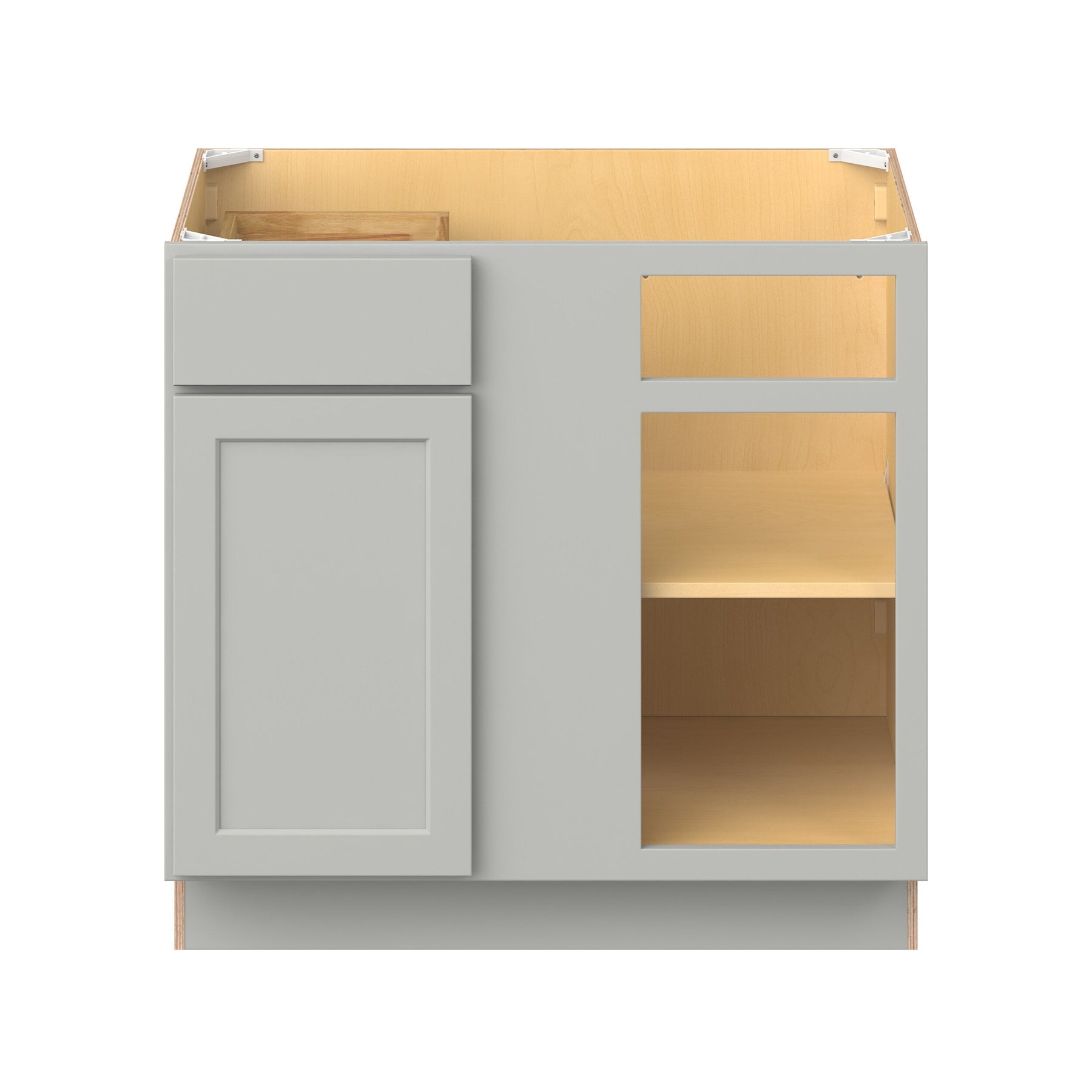 Upgrade your kitchen with the Hugo&Borg PRO Jasper Corner Cabinet in Whisper Gray. This ready-to-assemble cabinet boasts durable all-plywood construction and combines a clean Shaker design with ample storage, including solid wood dovetail soft-close drawers and adjustable features.
