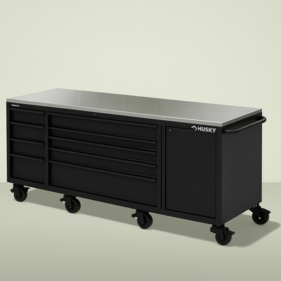 The Husky 96-inch Mobile Workbench is a statement piece for any workshop, combining robust functionality with sleek design. Its matte black finish and stainless steel top exude sophistication while providing a durable workspace. The nine spacious drawers and integrated power centers make it a versatile tool for professionals and enthusiasts alike. Style it in your garage or workspace to create an organized and efficient environment that inspires productivity.