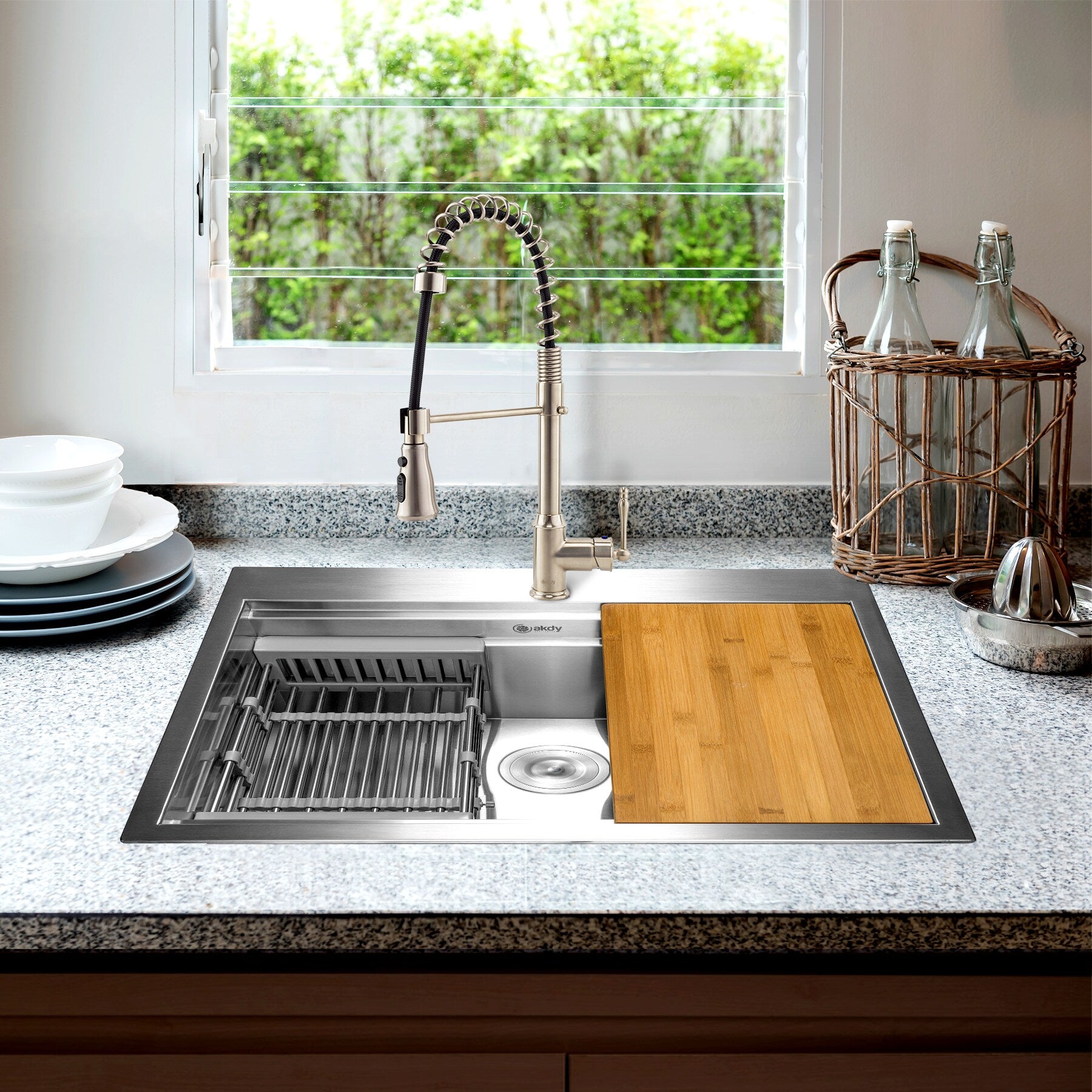 This AKDY all-in-one workstation sink pairs a 33 x 22 in. brushed stainless steel single-bowl drop-in sink with a pro-style pull-down faucet and accessories. Built from durable 304 stainless steel with sound-dampening pads, it streamlines prep and cleanup with integrated ledges for the bamboo cutting board and roll-up drying rack.