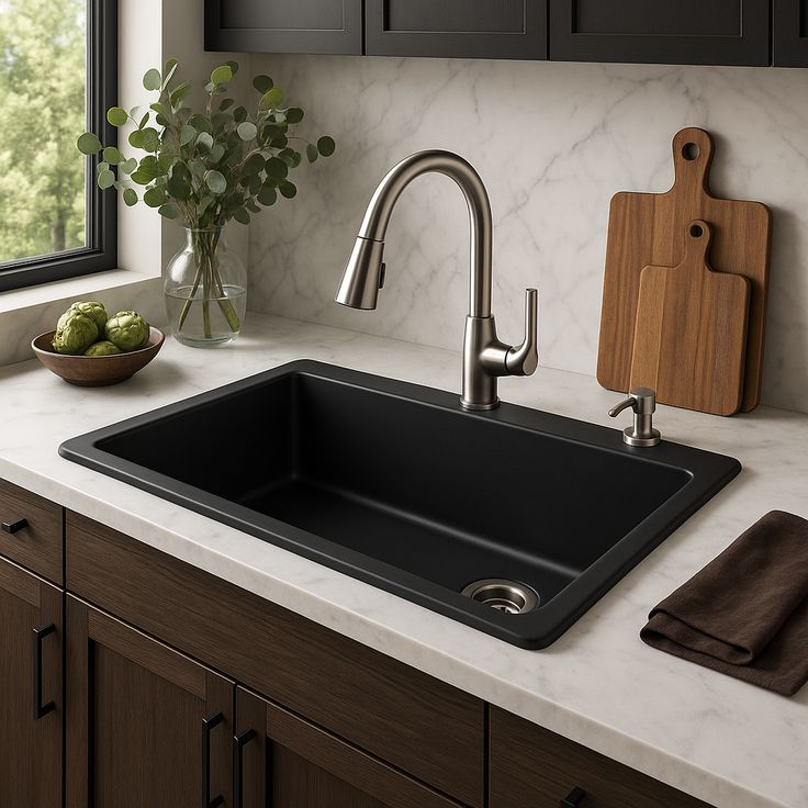 The KOHLER Neoroc Matte Black Kitchen Sink Kit transforms your kitchen into a haven of modern sophistication. Its matte black finish exudes a rich, dimensional allure, while the composite material ensures durability and resilience. Pair this sink with vibrant stainless fixtures for a striking contrast, or complement it with natural wood tones for a warm, inviting ambiance. This kit is not just a functional centerpiece but a statement of refined taste, essential for creating a luxurious culinary space.