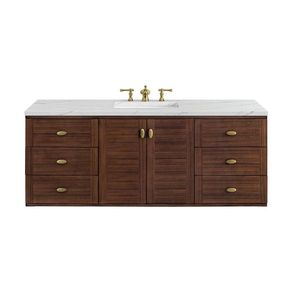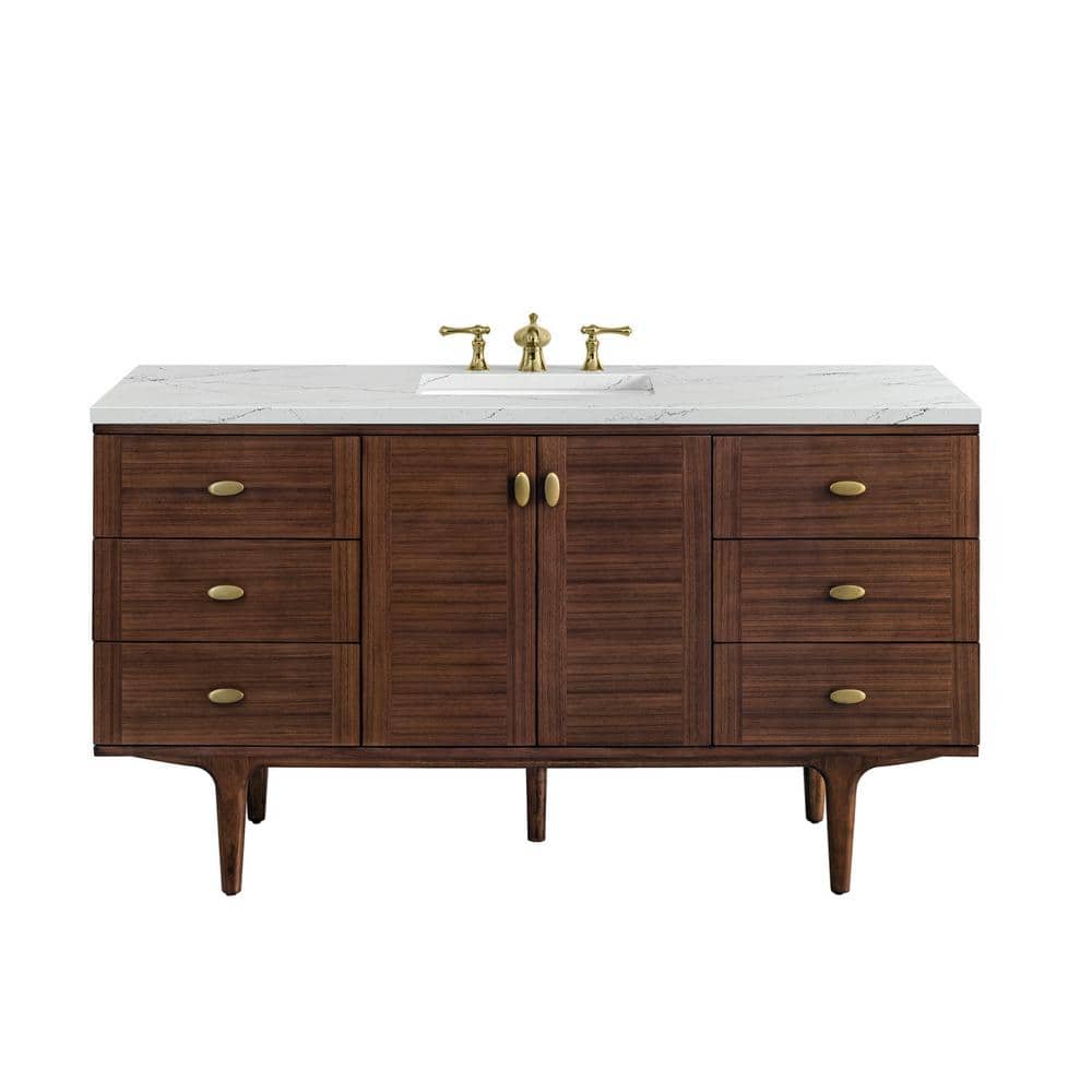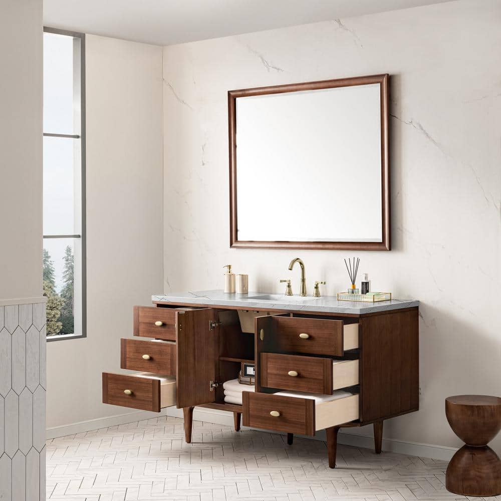 The Amberly Vanity transforms any bathroom into a sanctuary of style and sophistication. Its mid-century walnut finish exudes warmth and character, while the quartz top adds a touch of modern luxury. Pair it with brass fixtures to enhance its elegant appeal, and consider wall-mounting for a contemporary floating effect. This vanity is not just a piece of furniture; it's a statement of refined taste and practical design.