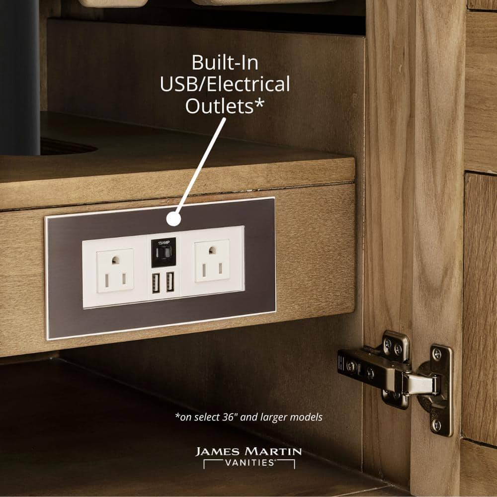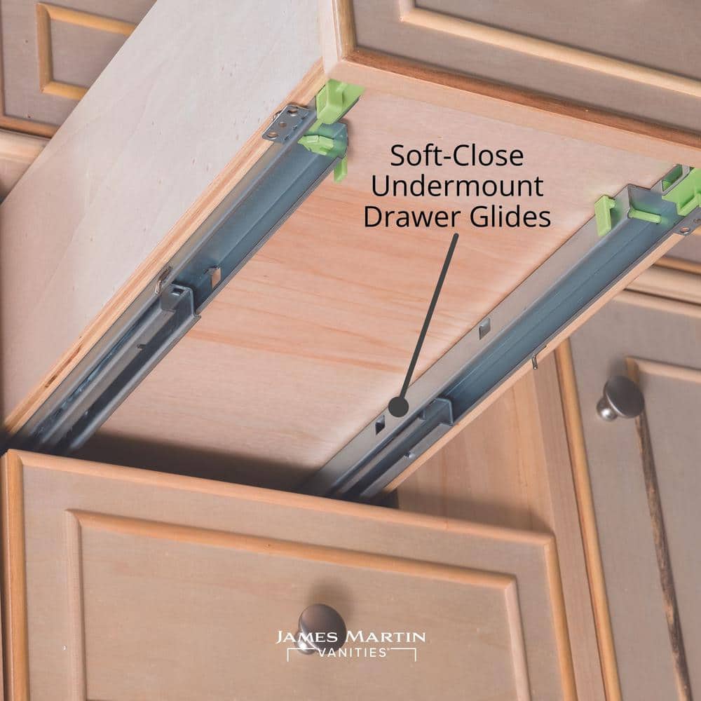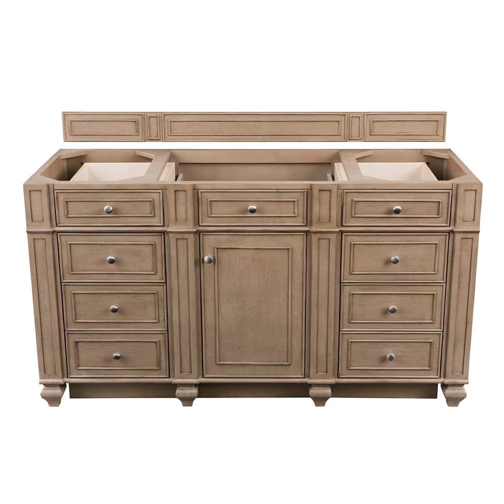 The Bristol 60" Bathroom Vanity Cabinet by James Martin Vanities combines traditional design with modern functionality. Crafted from solid wood in a whitewashed walnut finish, it features ample storage, soft-close doors and drawers, and a durable plinth base for easy cleaning.