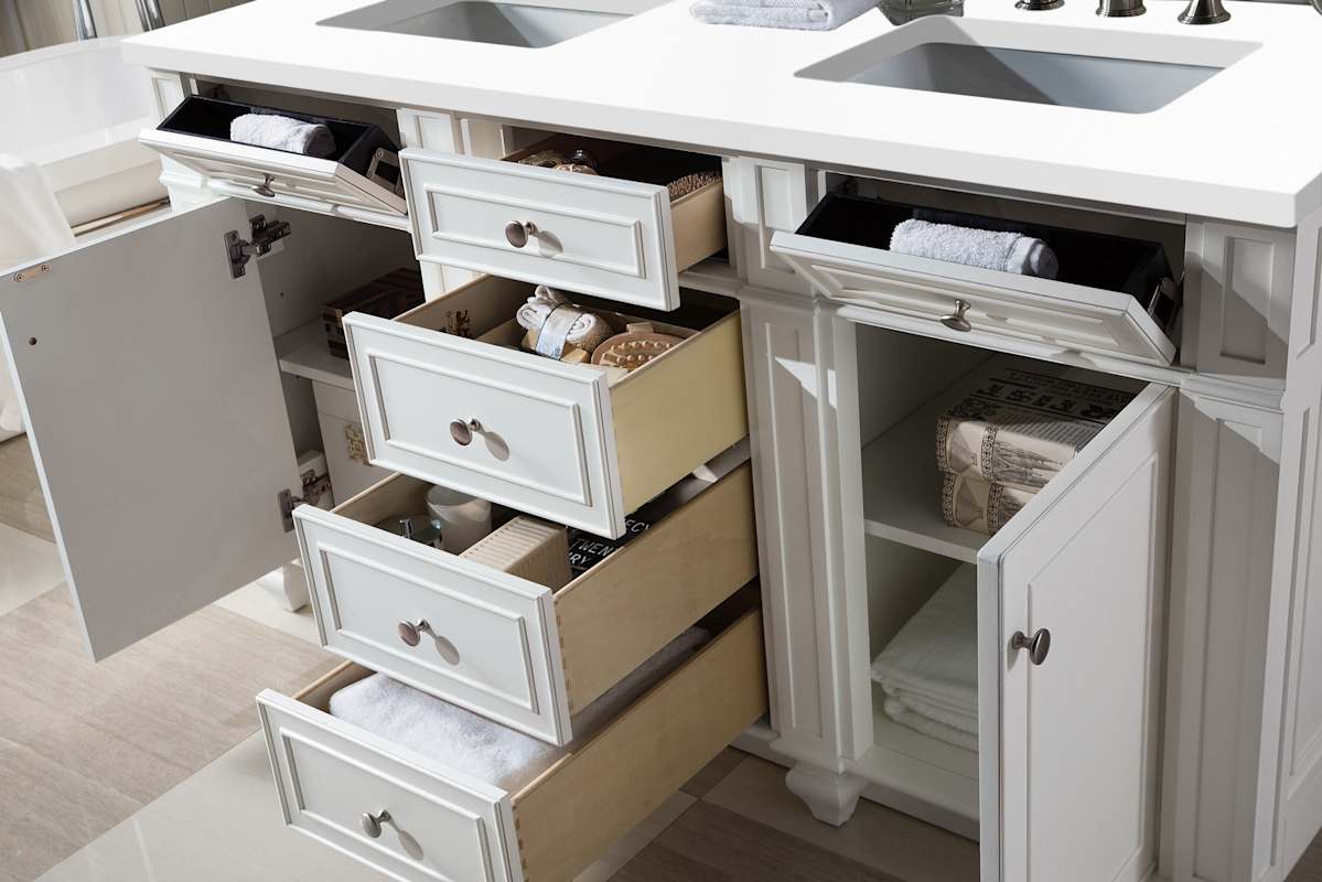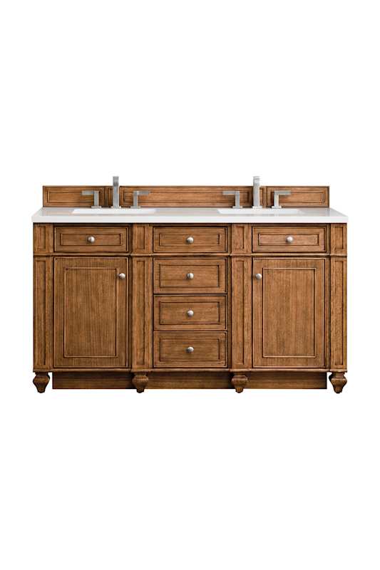 The Bristol 60-inch double vanity combines a solid wood cabinet in a rich Saddle Brown finish with a durable 3cm Silestone White Zeus quartz top. Two rectangular ceramic sinks, soft-close doors and drawers, and a full plinth base deliver lasting performance and easy cleaning. Includes a matching 4-inch wood backsplash and satin nickel hardware; faucets sold separately.