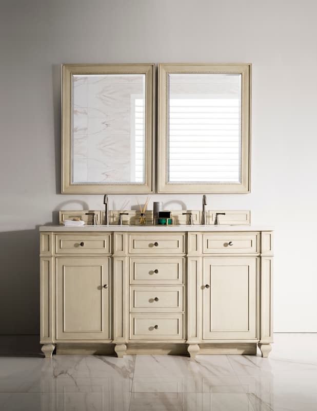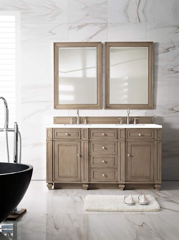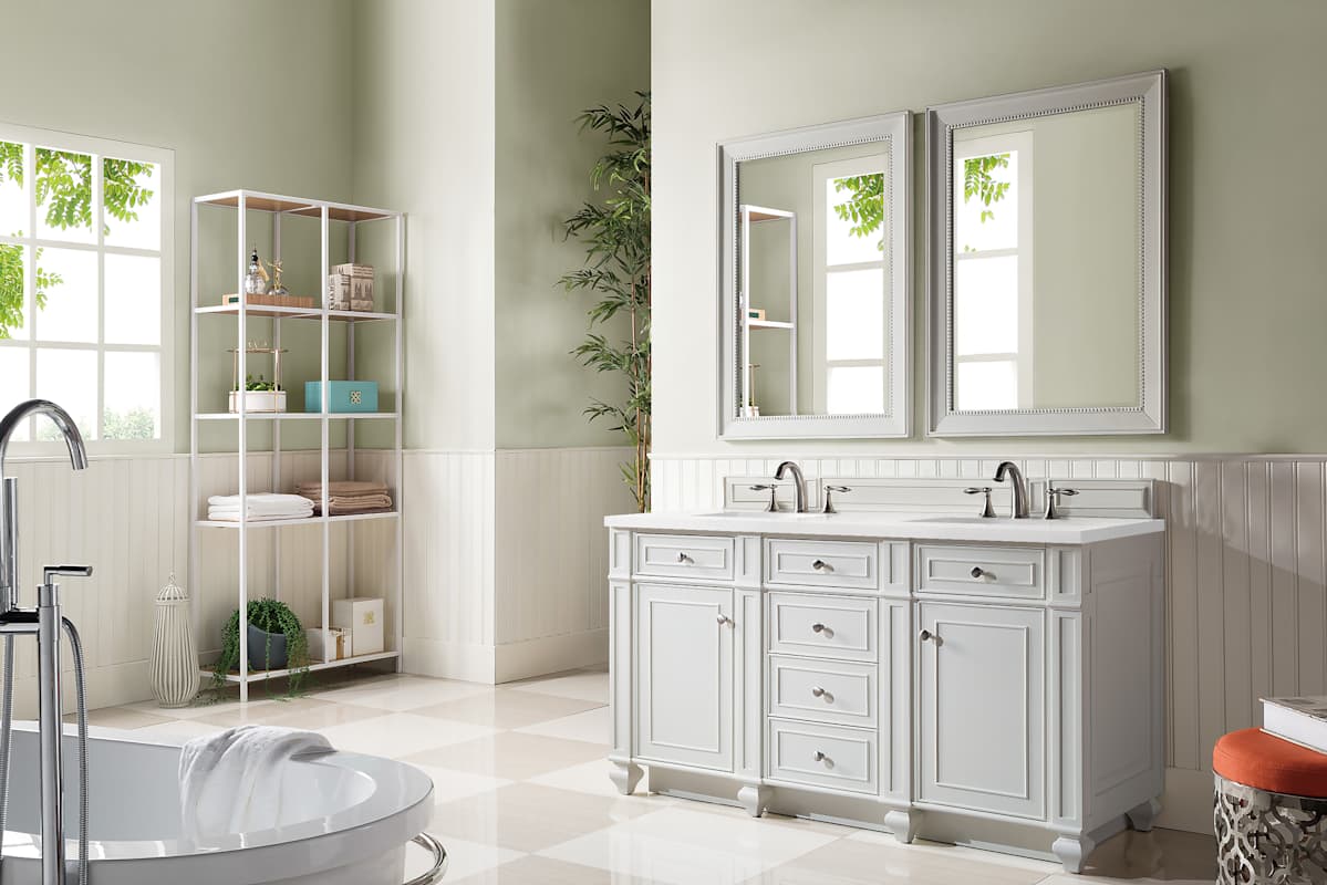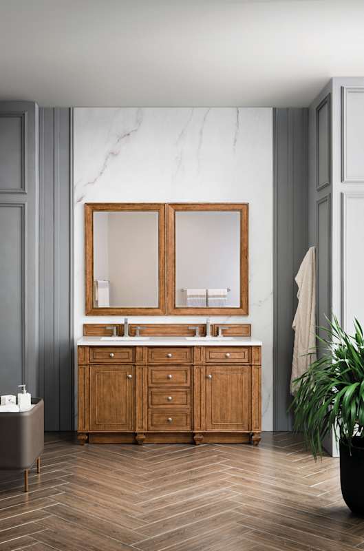 Bristol’s sculpted panels and tulip legs bring a tailored elegance that feels collected and timeless. The White Zeus quartz top is a crisp counterpoint to the warm Saddle Brown wood, highlighting the vanity’s refined bead detailing. Style with twin framed mirrors and brushed nickel widespread faucets to echo the satin hardware. It’s a beautifully balanced focal point—essential for a layered, luxurious bath.