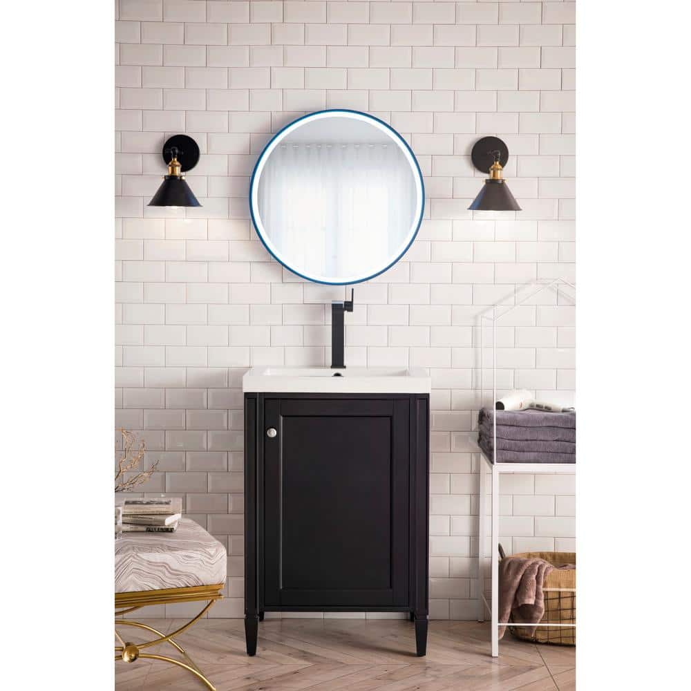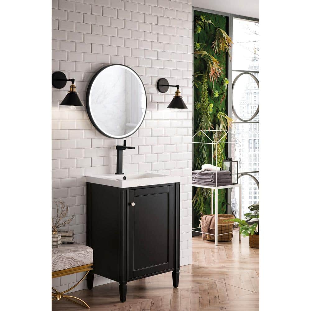The Brittania 24 in. Bath Vanity by James Martin Vanities combines modern design with practical functionality. Featuring a black onyx finish and a durable resin top, this vanity offers ample storage and a sleek, elegant look for any bathroom.
