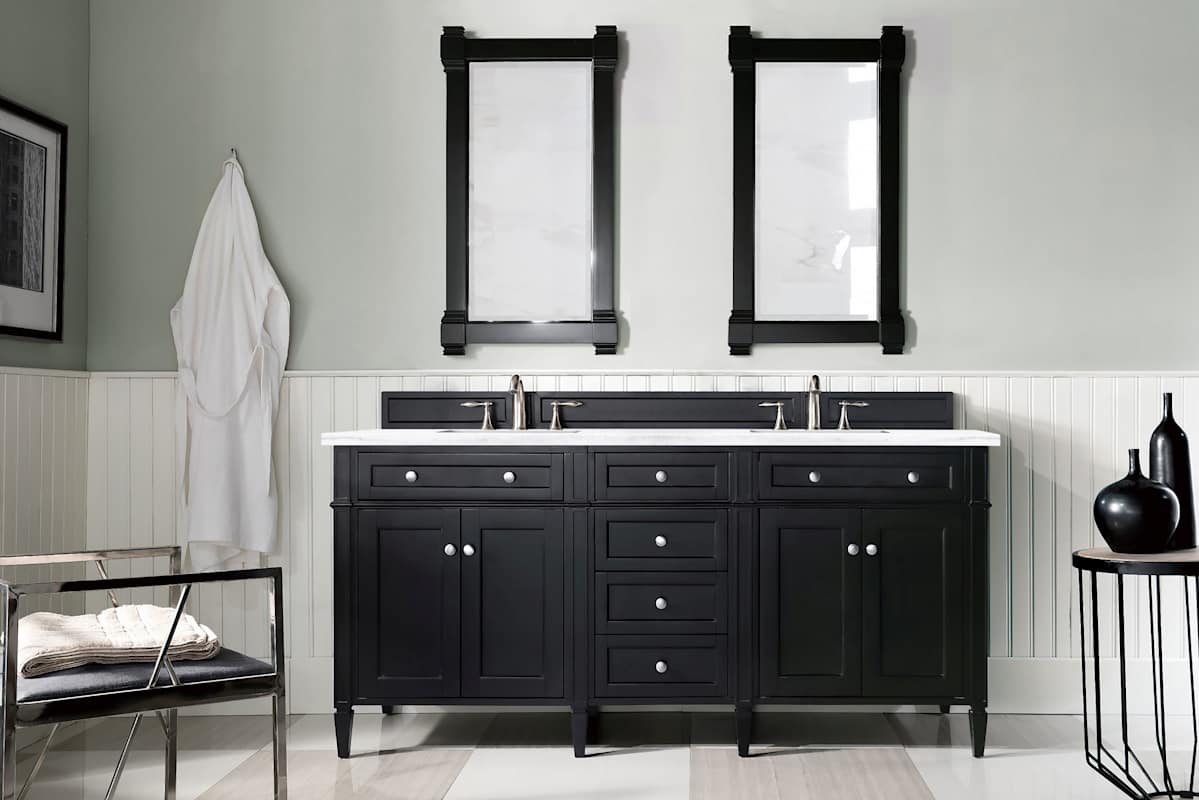Upgrade your primary bath with this durable, turnkey double vanity—choose Brittany for timeless style, abundant storage, and an easy-care solid surface top.