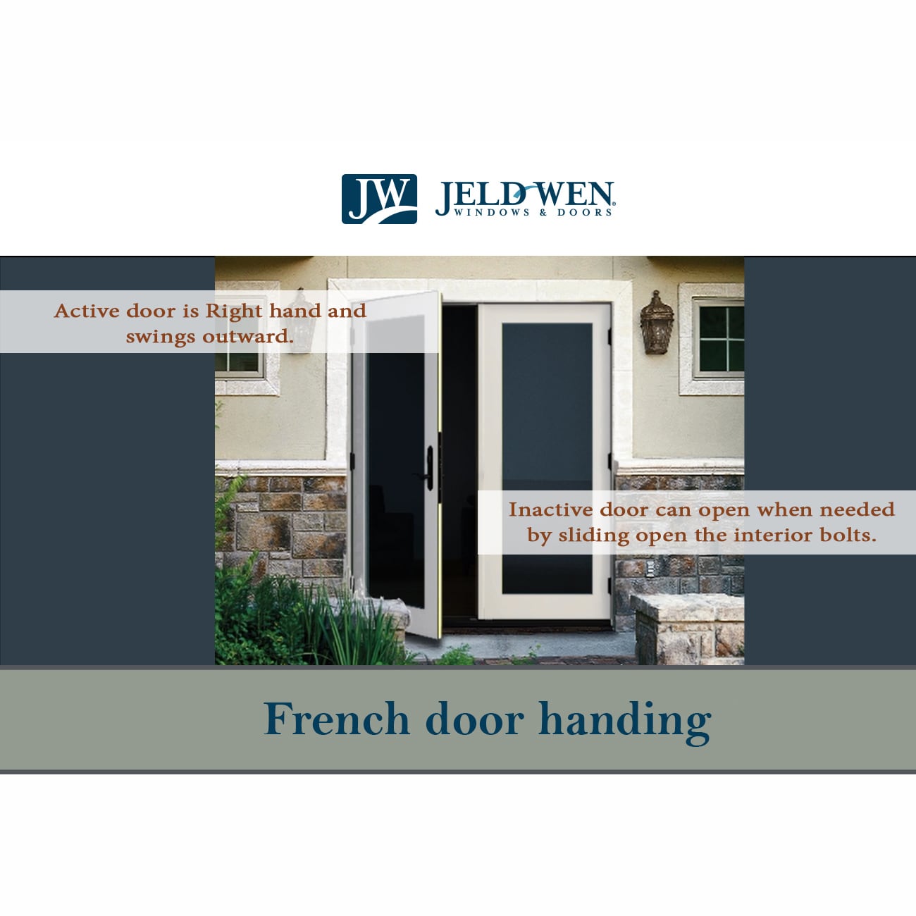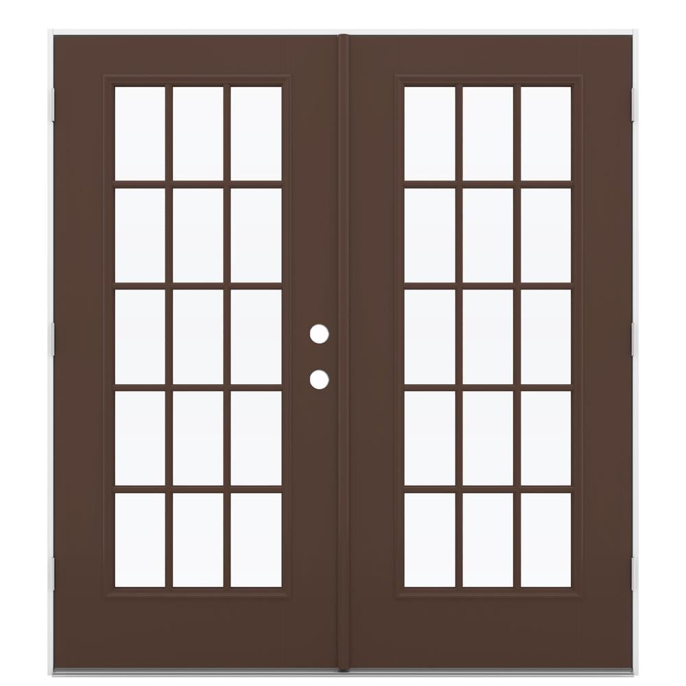 Energy-efficient JELD-WEN fiberglass French patio door with Low-E tempered glass in a rich Dark Chocolate finish. Prehung right-hand outswing double door with 4-9/16-in jamb delivers durability that resists dents, warping, and rot for long-lasting performance.