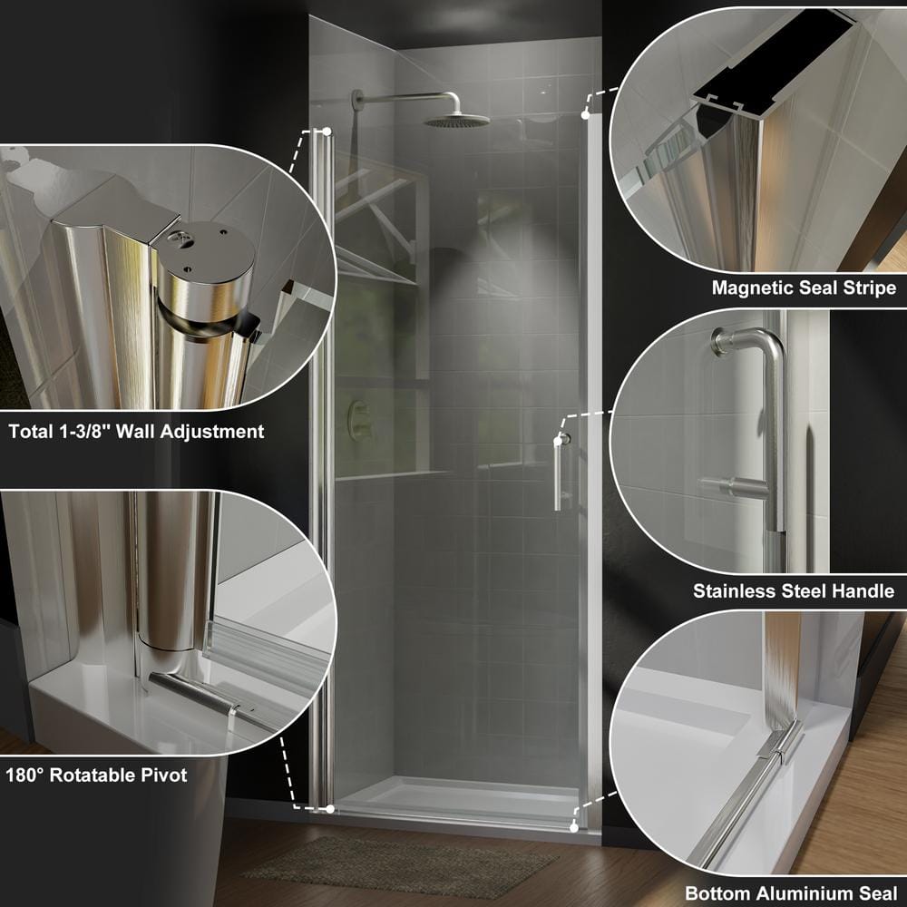 Q: How does the pivot door mechanism work? A: The pivot hinge allows the door to swing open smoothly outward, providing easy access to the shower.