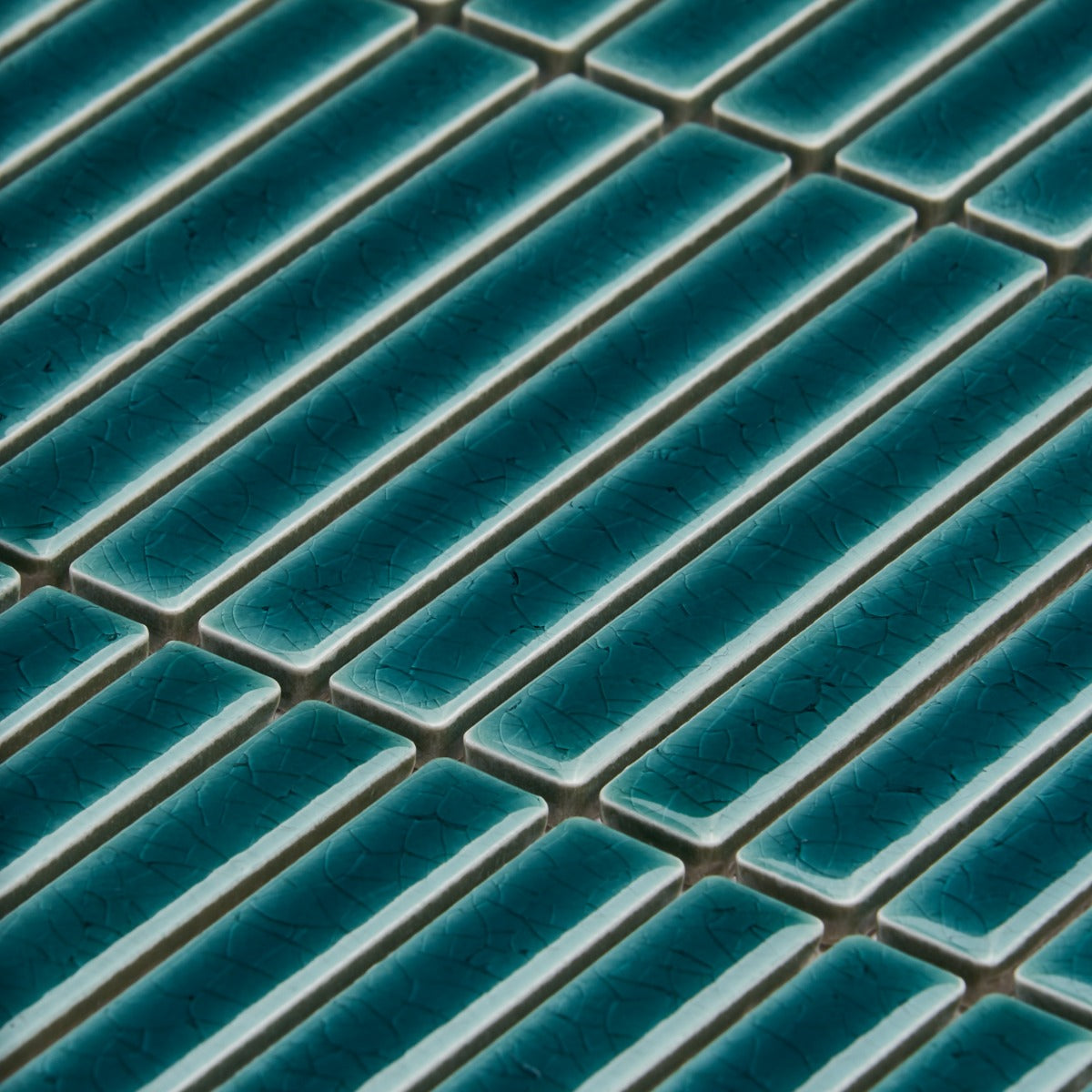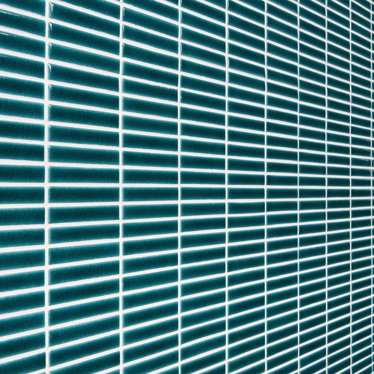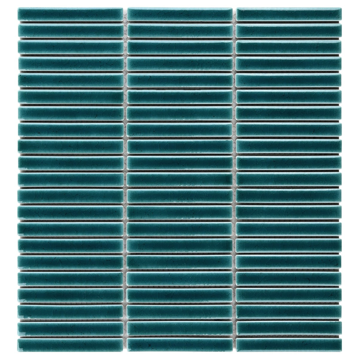 The Kai Teal Mosaic Tile features a durable porcelain construction with a crackled glossy finish, offering a modern twist to a classic design. Its rich teal color and versatile application make it ideal for backsplashes, showers, and outdoor spaces.