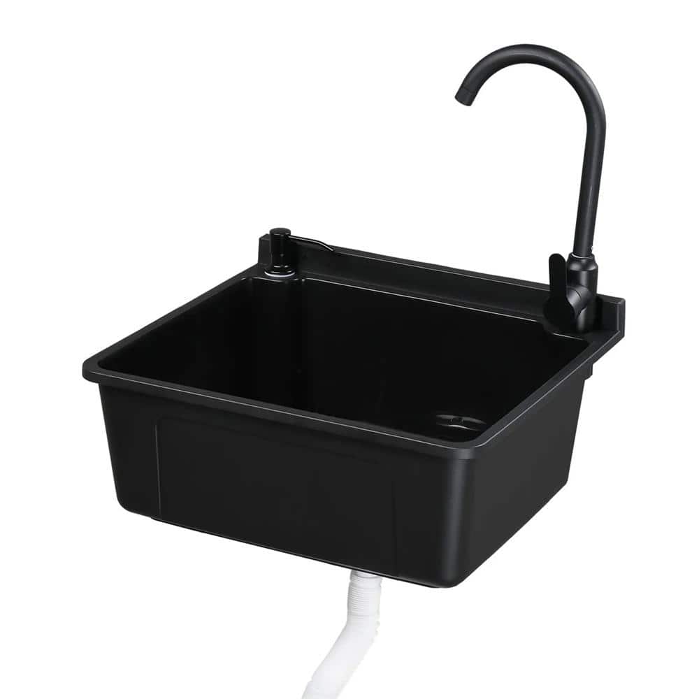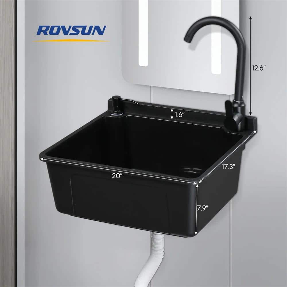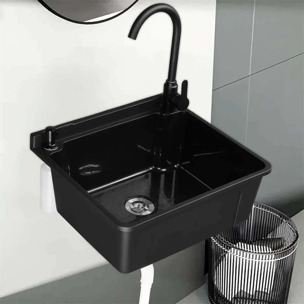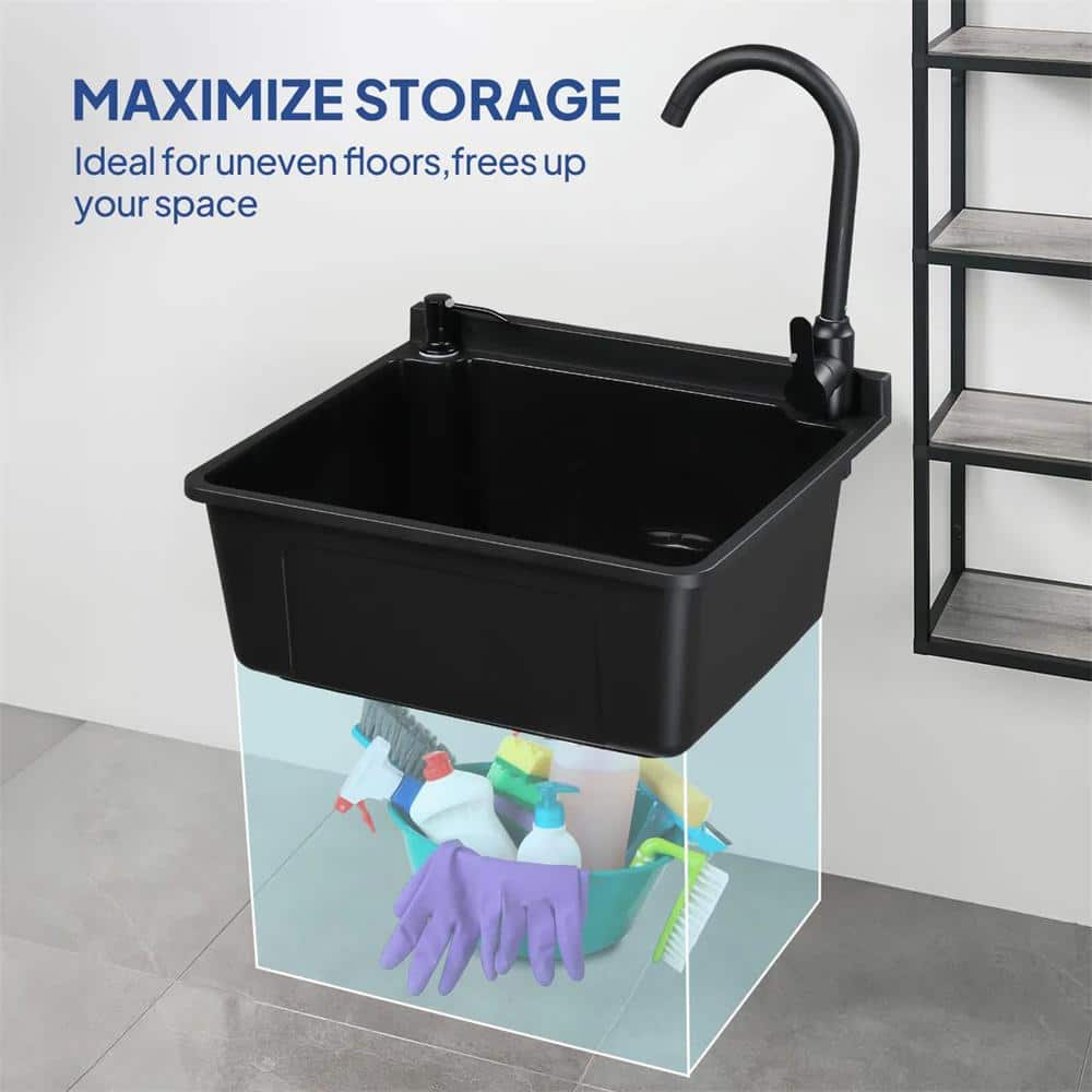The Karl Home Wall-Mount Utility Sink in Black is a space-saving solution perfect for laundry rooms, workshops, and garages. Constructed from lightweight, durable plastic, this utility sink resists chips, cracks, and stains while offering easy maintenance. Its sleek design comes with an included faucet, saving you extra cost and installation time.