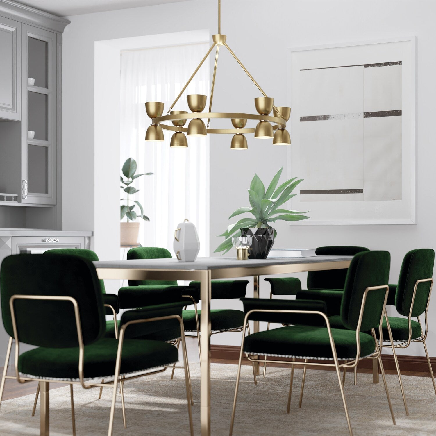 Transform your living space with the Kichler Baland Chandelier, a mesmerizing blend of form and function. Adorned in Brushed Natural Brass, its ceramic-inspired cups exude modern mid-century charm, casting a warm glow that speaks volumes in elegance. Imagine it gracing a dining area adorned with brass accents and monochrome art, setting the stage for sophisticated gatherings. The Baland Chandelier isn't just lighting; it's a statement piece, essential for those who savor contemporary style.