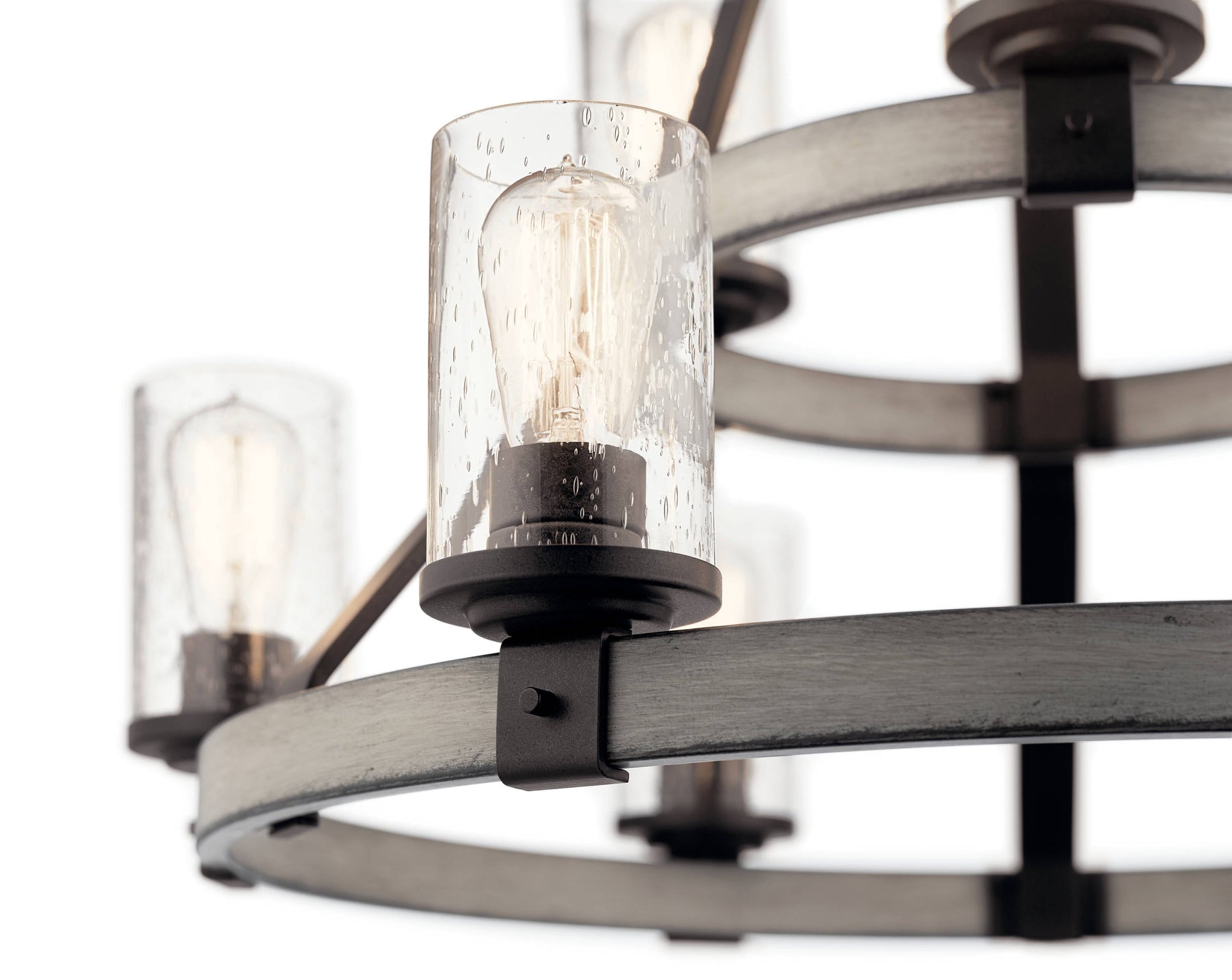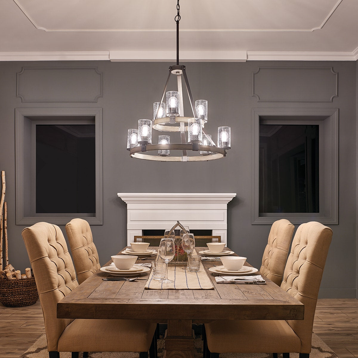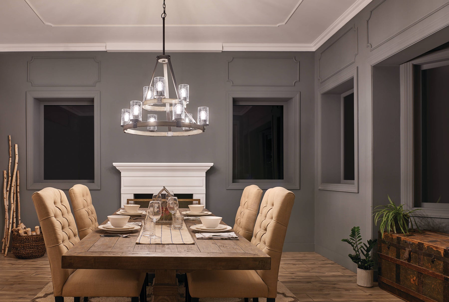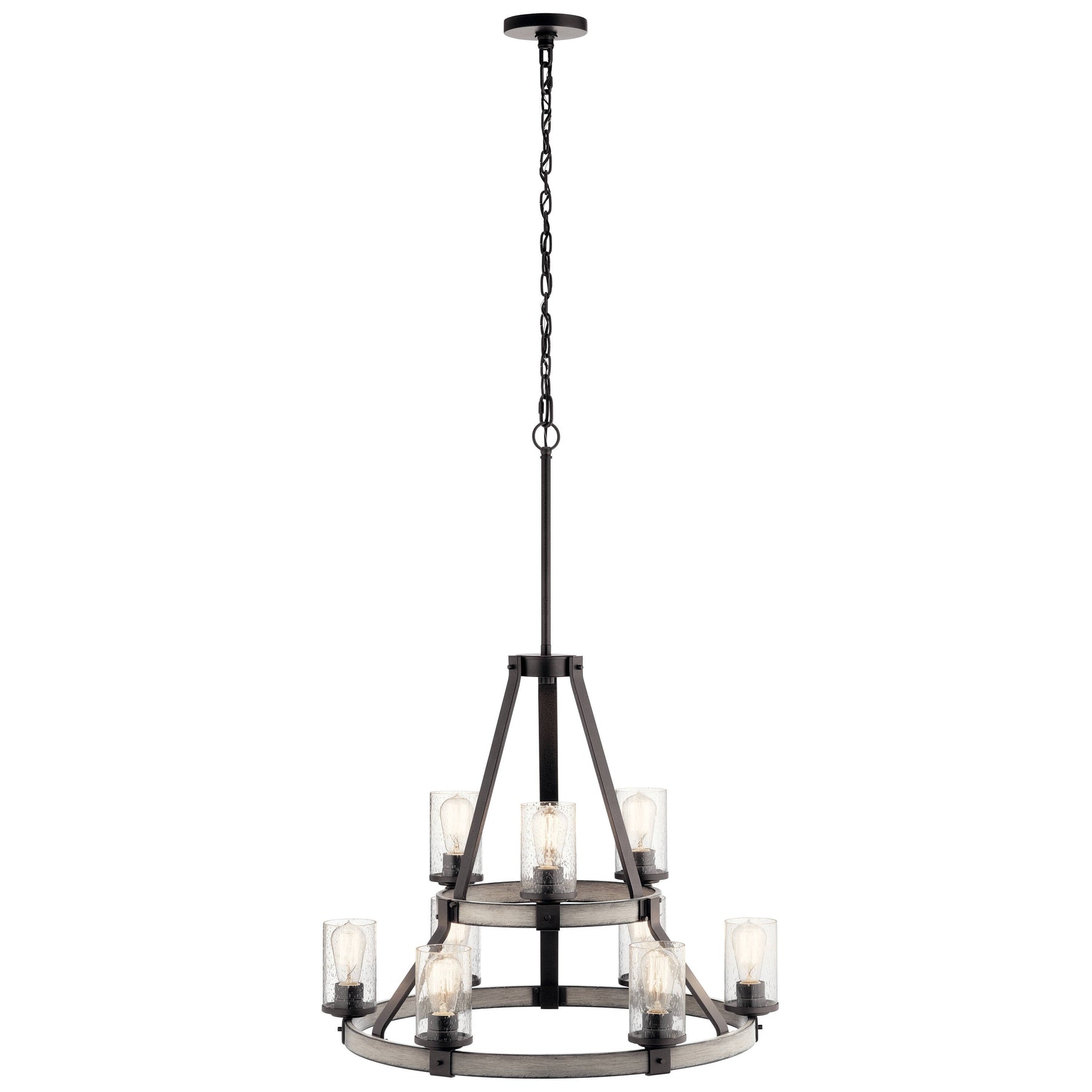 Elevate your interiors with the Kichler Barrington 9-Light Rustic Chandelier, an exquisite blend of anvil iron and driftwood tones. This chandelier not only adds a stunning vintage appeal with its classic seeded glass shades but also transforms spaces with its versatile dimming feature.