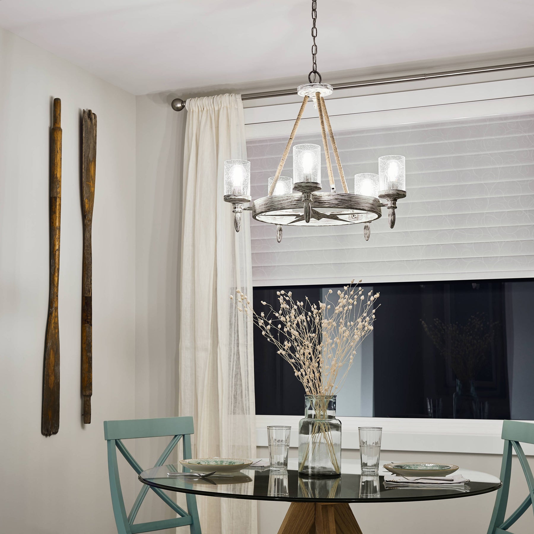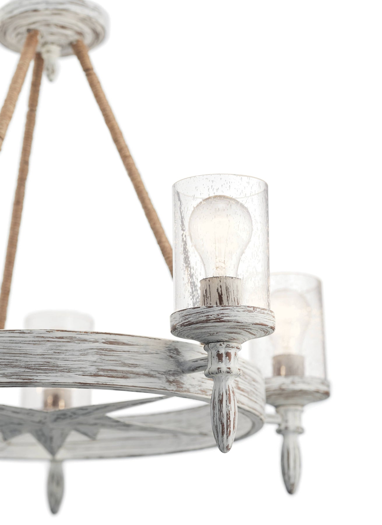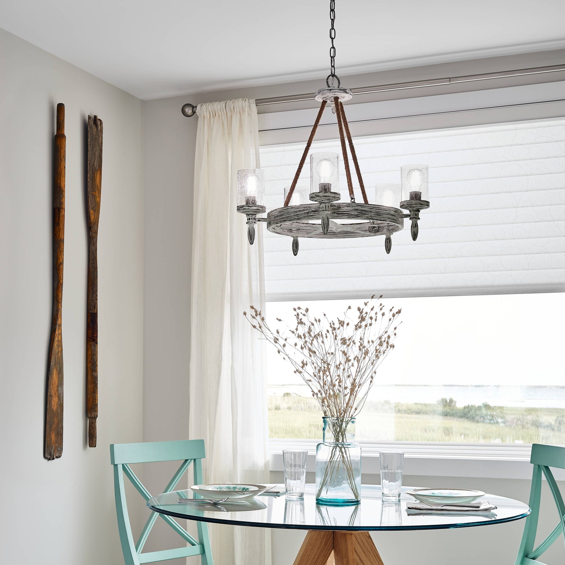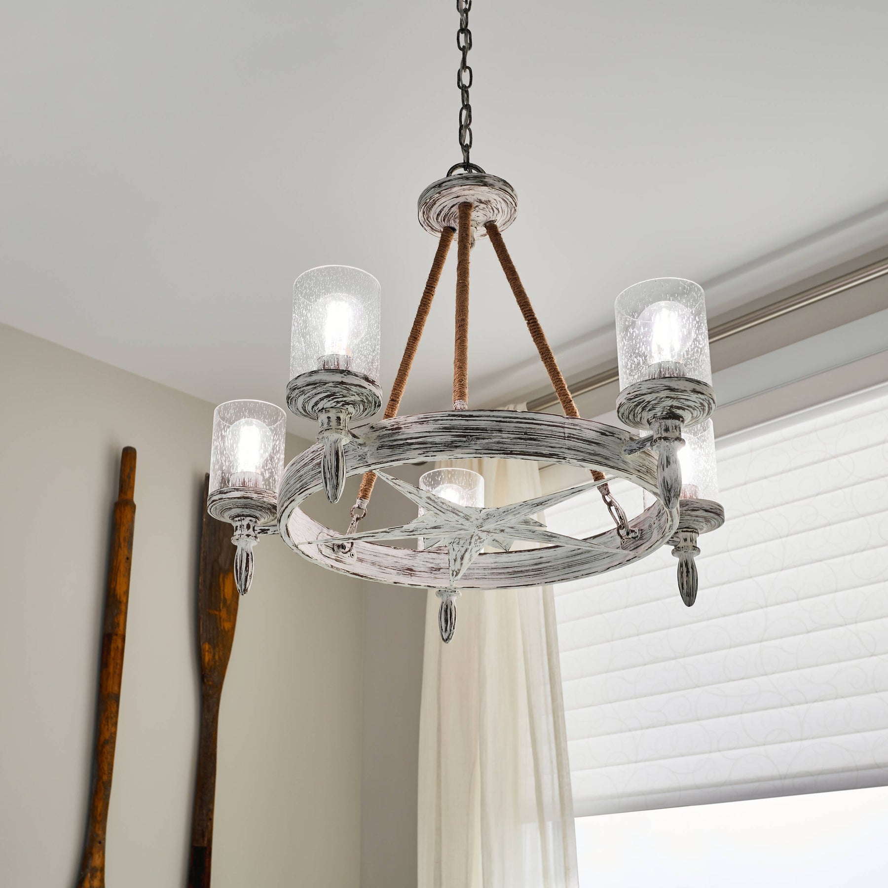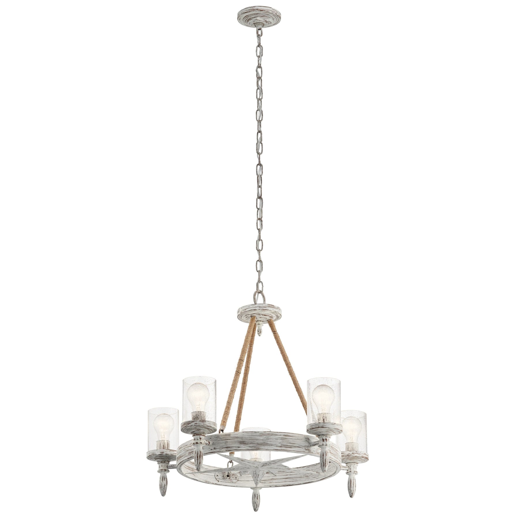 The Kichler Minnow 5-Light Chandelier embodies coastal charm with its distressed white finish and nautical accents. This chic chandelier features clear seeded glass shades that deliver warm, inviting illumination, perfect for any kitchen, dining, or living room setting.