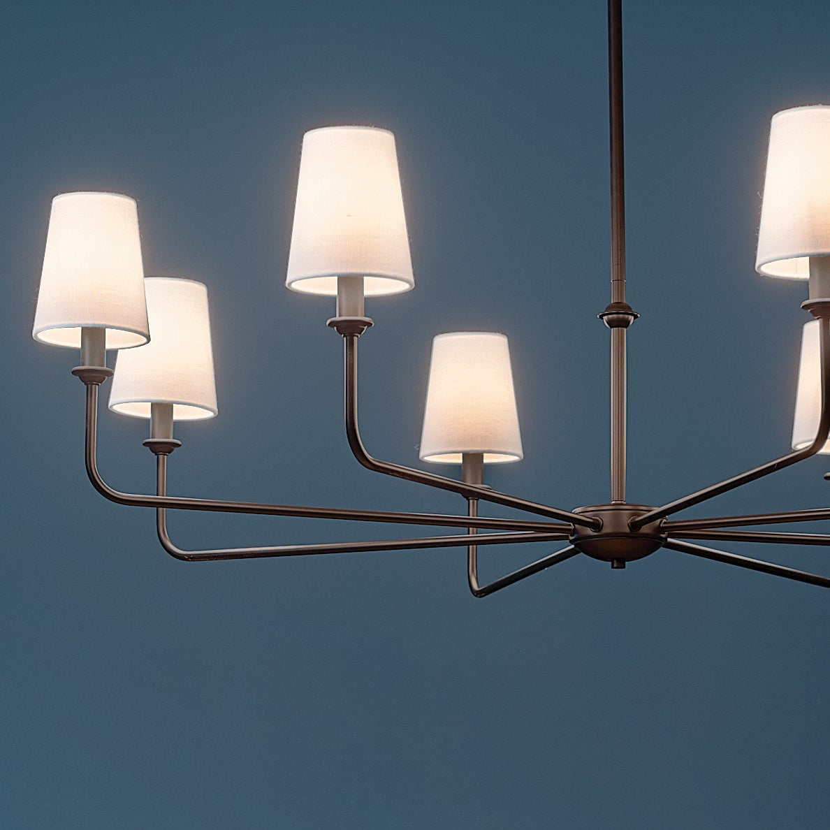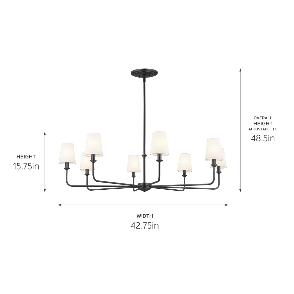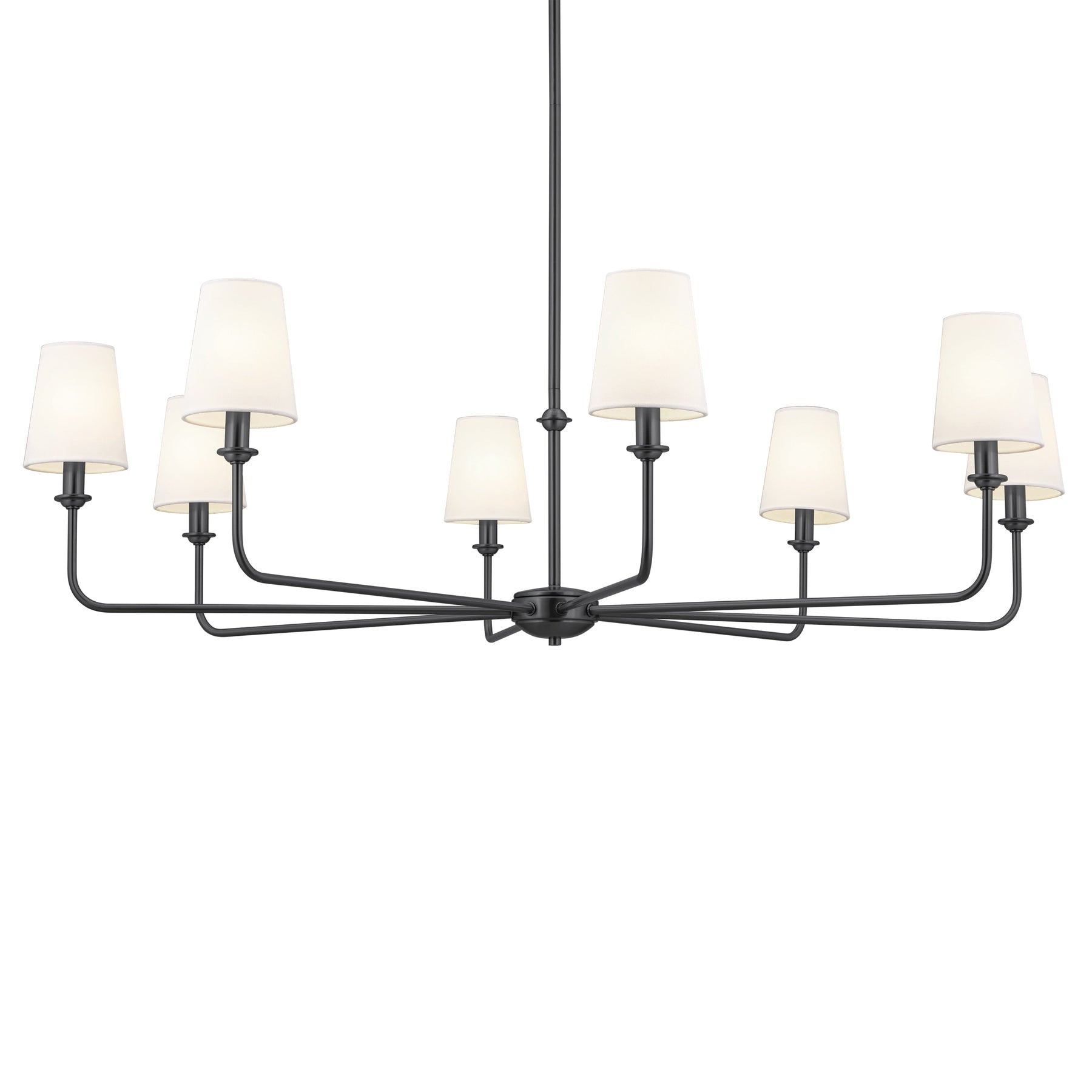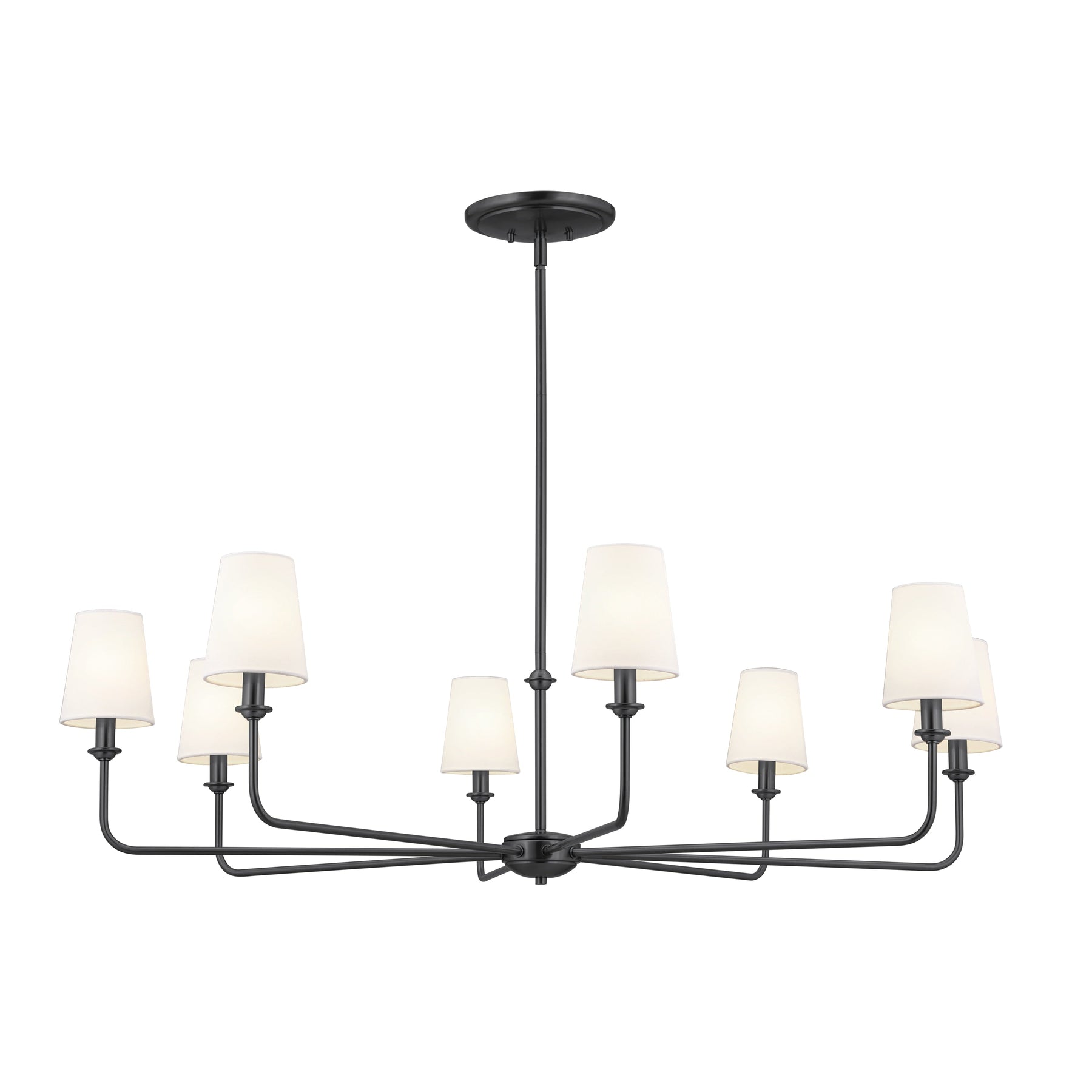 The Kichler Pallas 8-Light Chandelier combines classic elegance with modern versatility. Its steel body showcases a polished black finish, exuding sophistication, while the eight removable white linen shades provide ambient lighting tailored to your style. Ideal for enhancing dining areas, living spaces, or foyers, this chandelier adapts to various ceiling heights with its adjustable hanging mechanism.