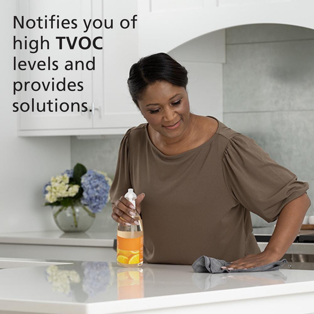 Q: Does it monitor other indoor air quality factors? A: Yes, it monitors temperature, humidity, and Total Volatile Organic Compounds (TVOCs), alerting you to possible health hazards.